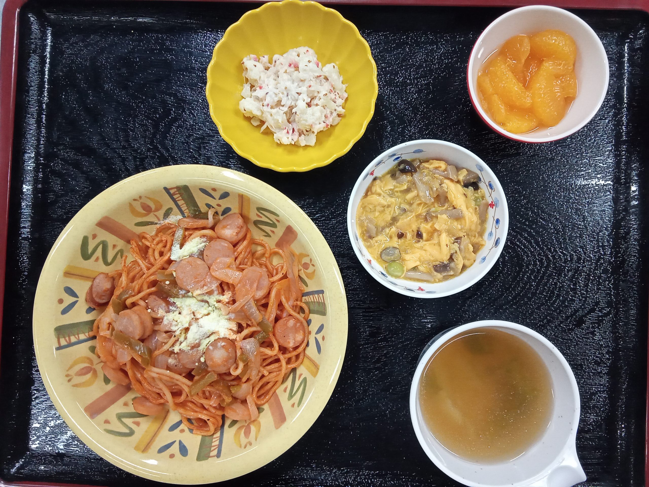 2/4は「スパゲッティナポリタン」を提供しました。スパゲッティはケチャップの味がついたものを購入し、そこにソースやケチャップで味付けした具材を加えました。久しぶりのナポリタン、普段はなかなか食が進まない方も美味しそうに召し上がっていました。