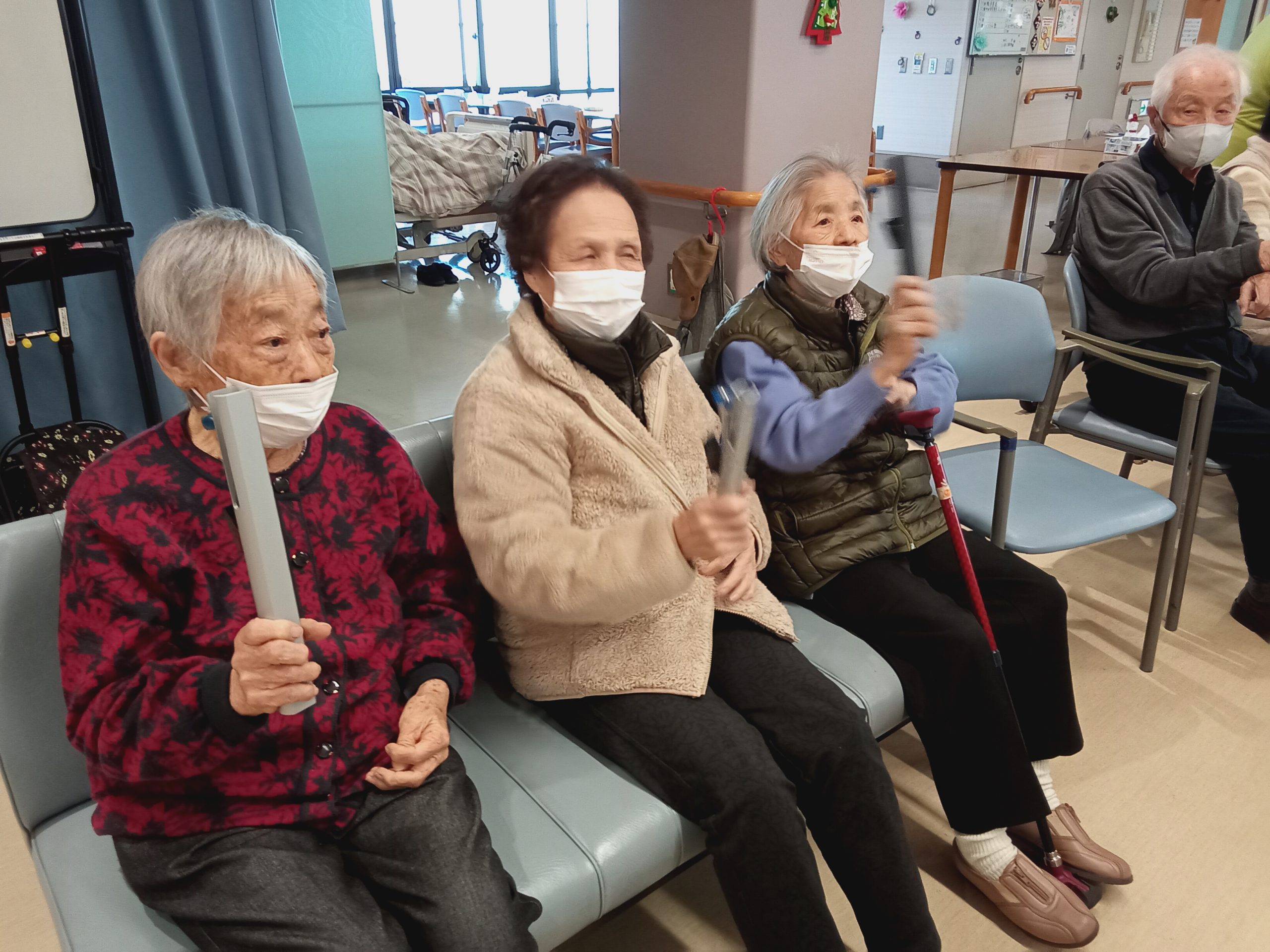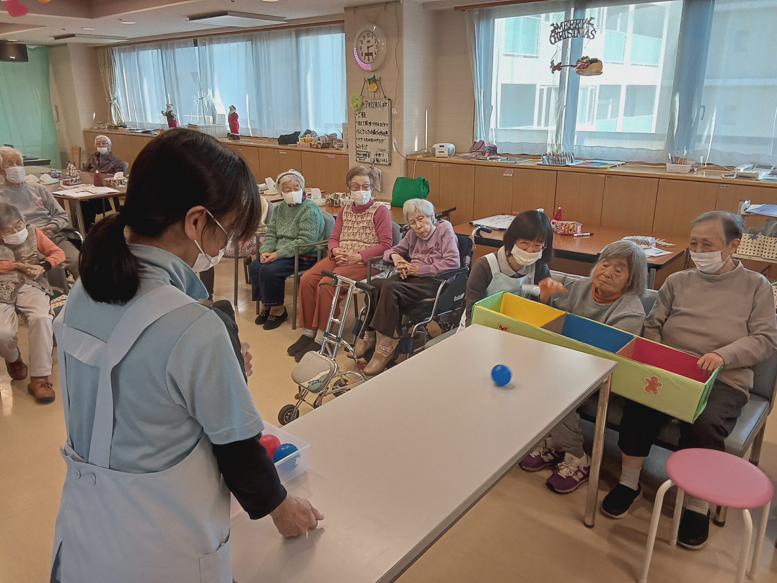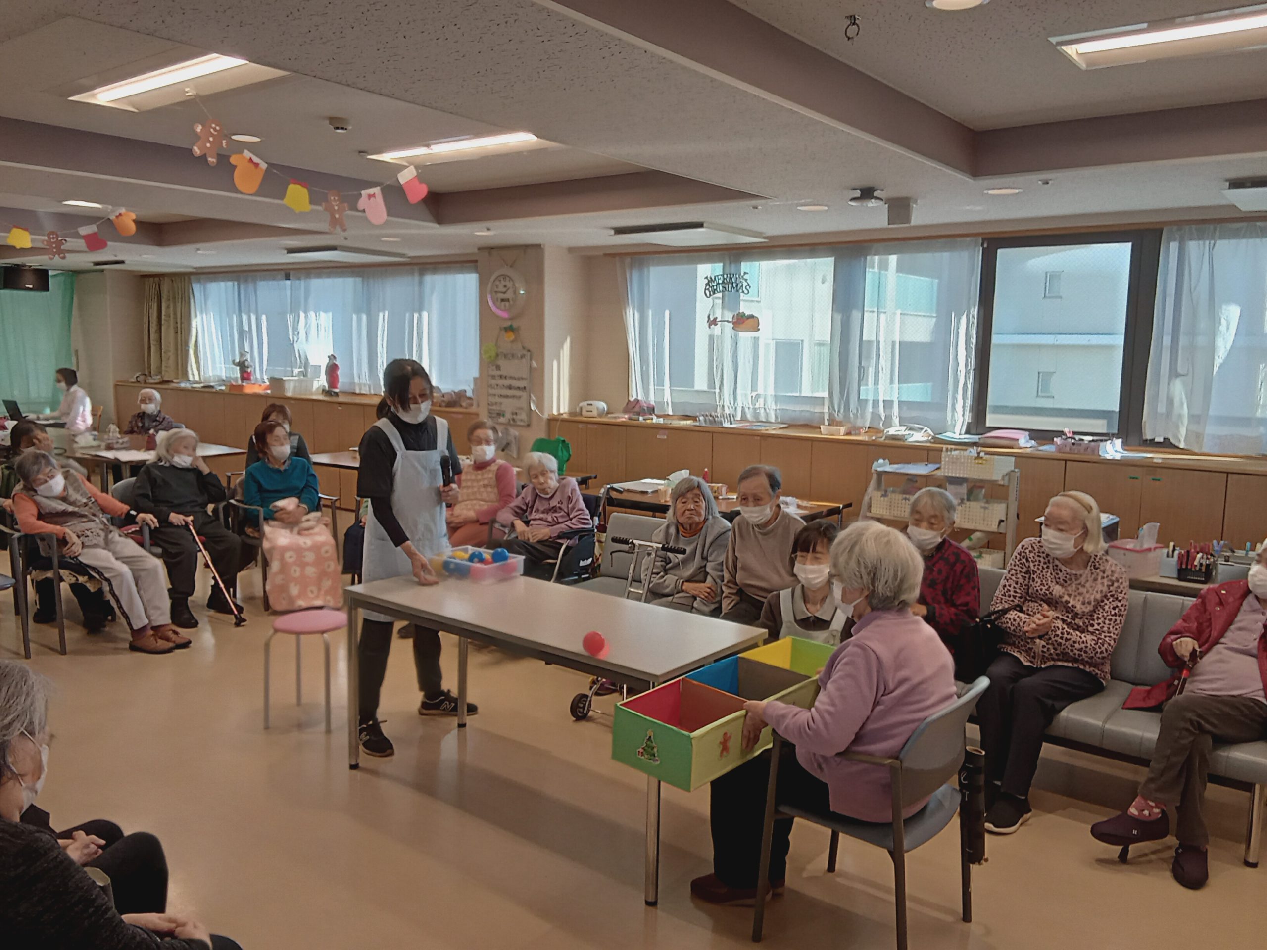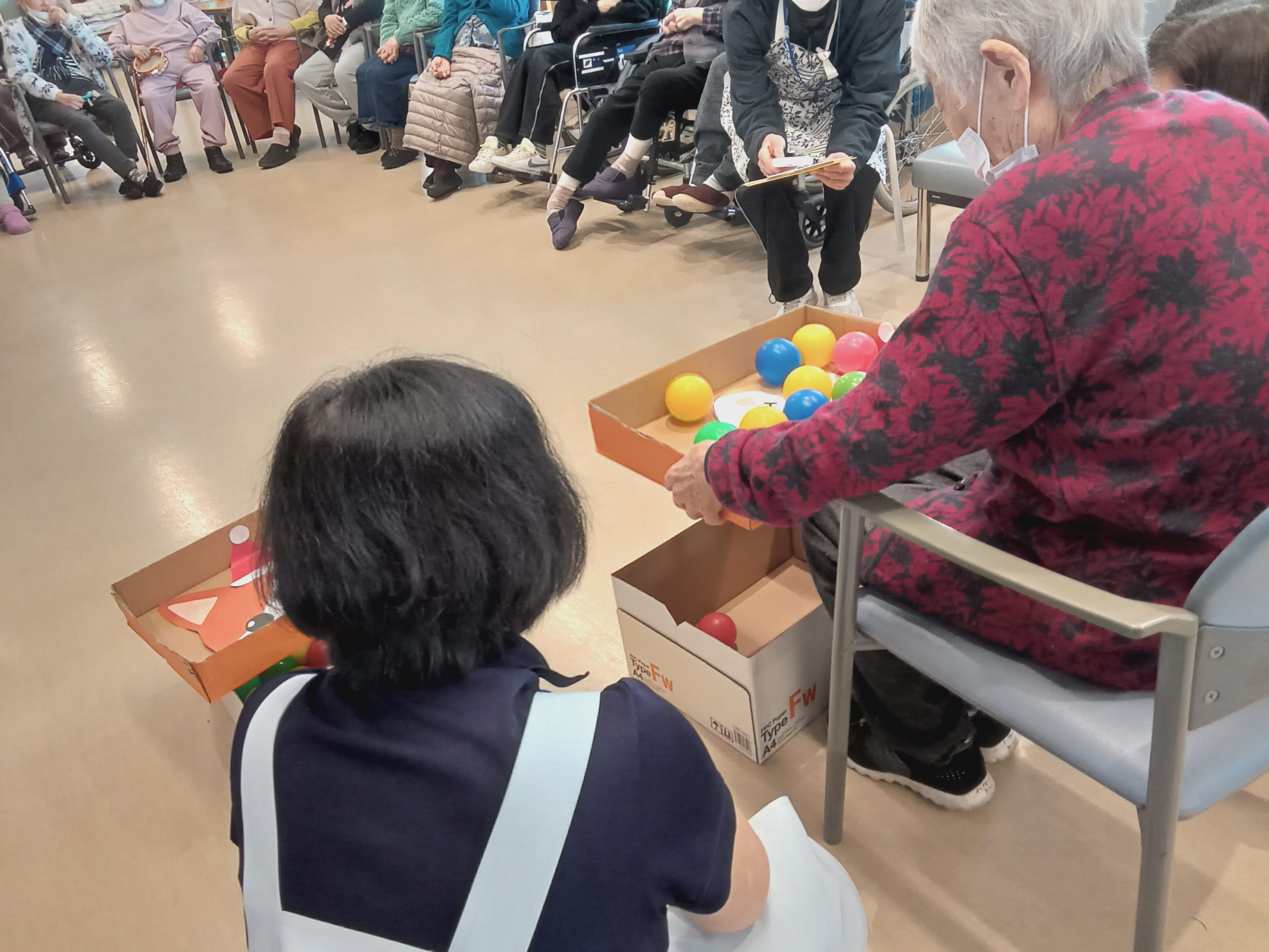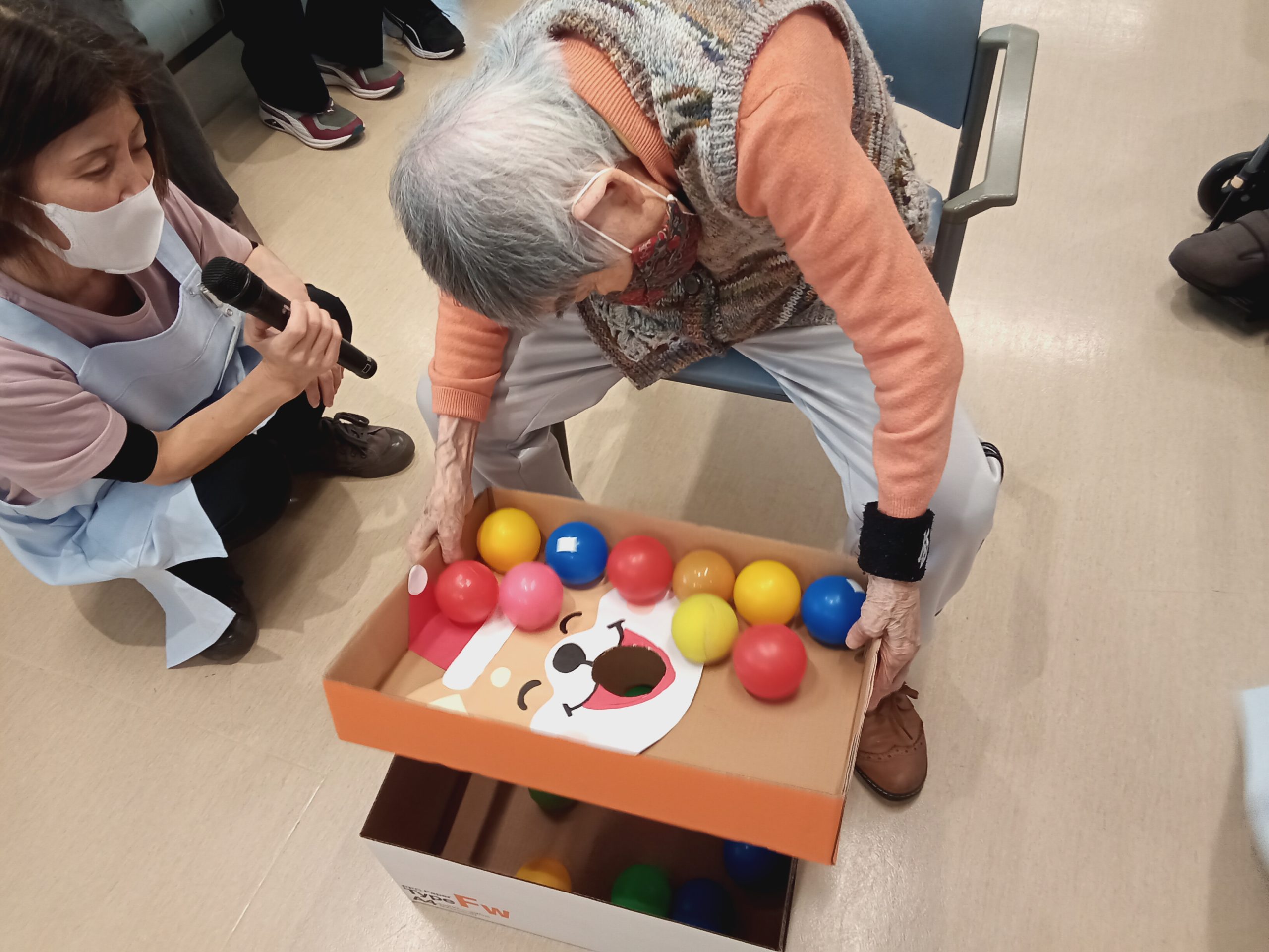 大きな箱を動かしてボールの色と同じ箱の色に入れます。頑張ってと他の方を応援されている様子が見られていました。最後は職員のサックス演奏。たくさんの拍手で盛り上がりました。
