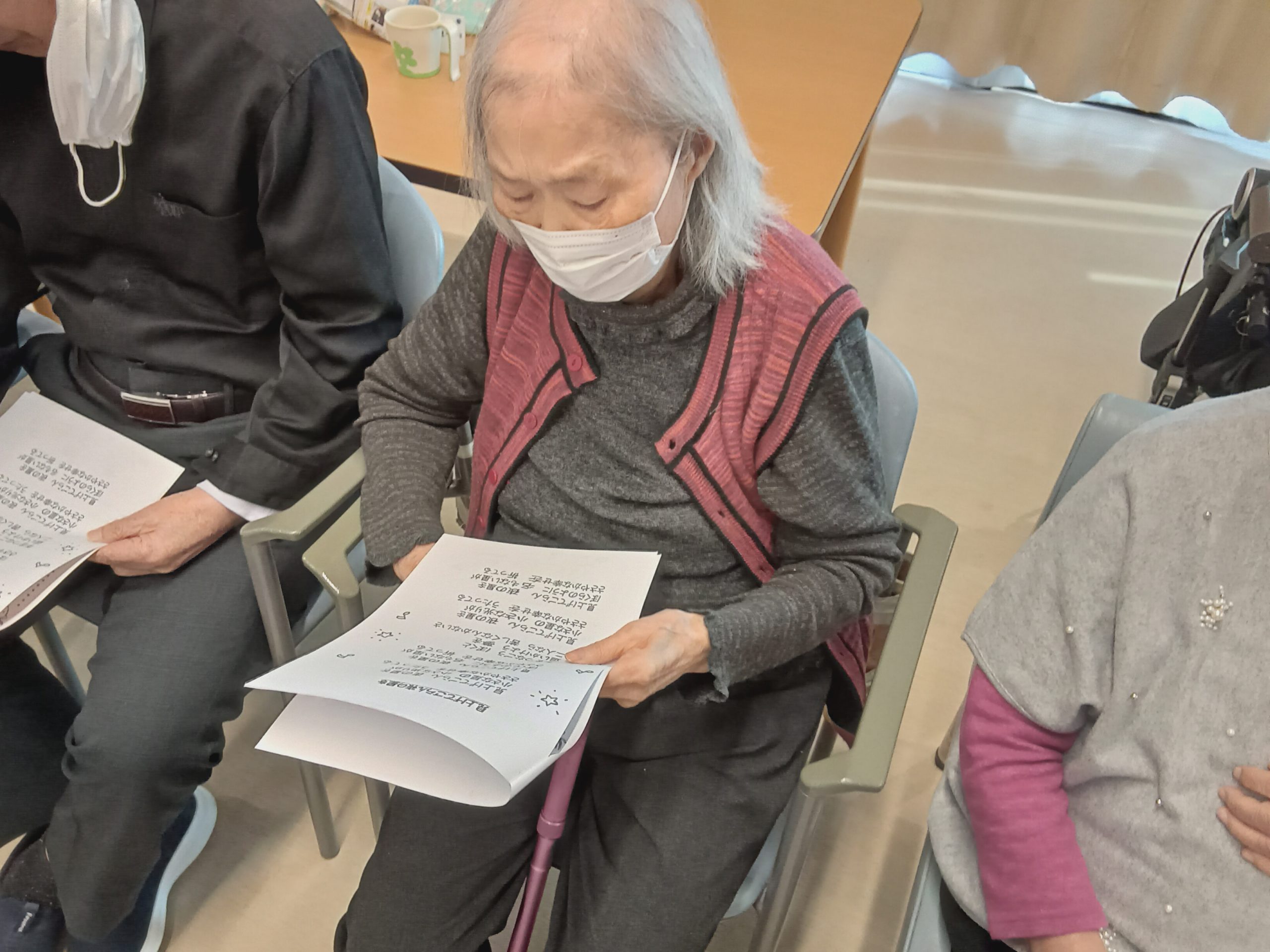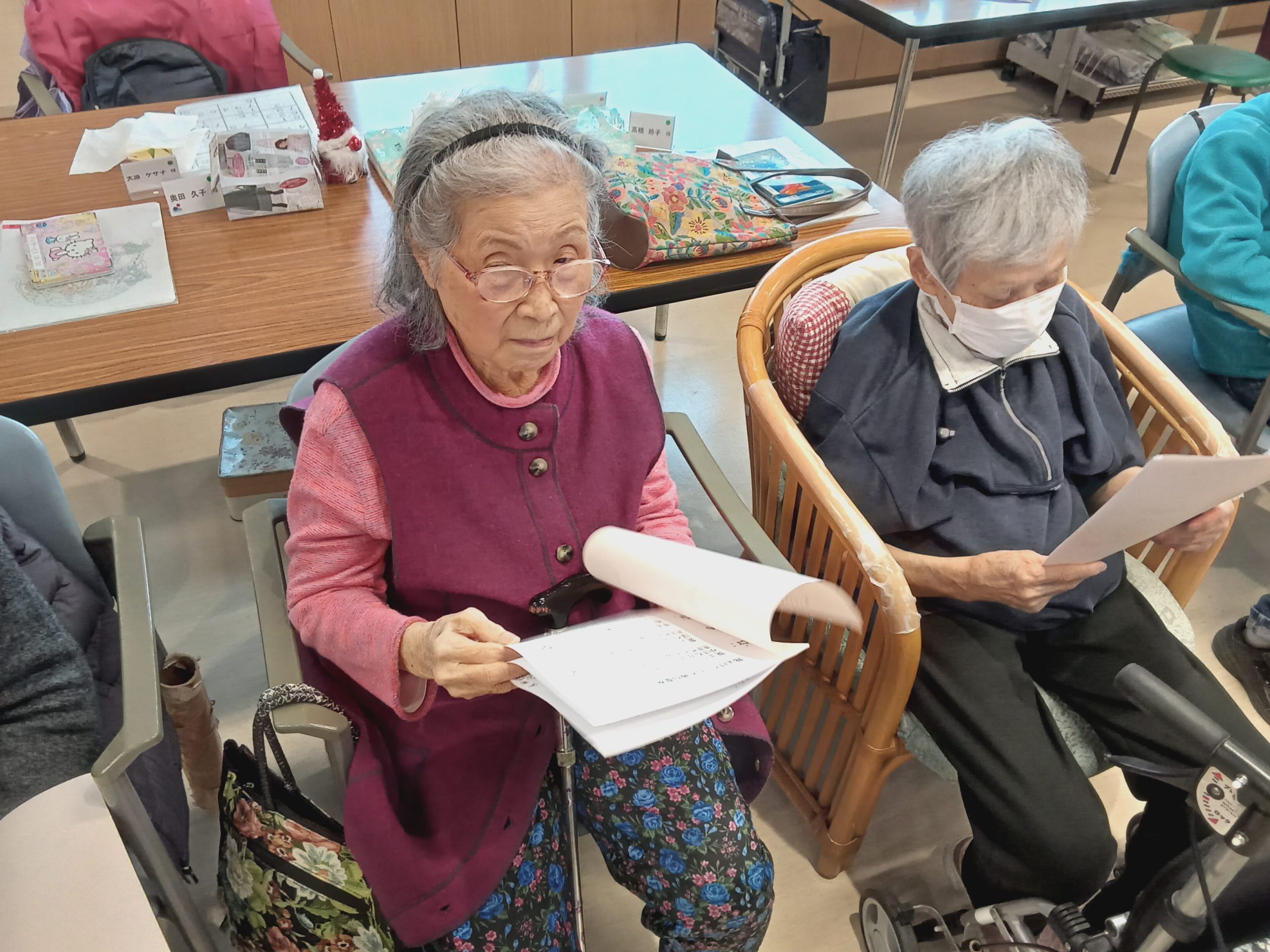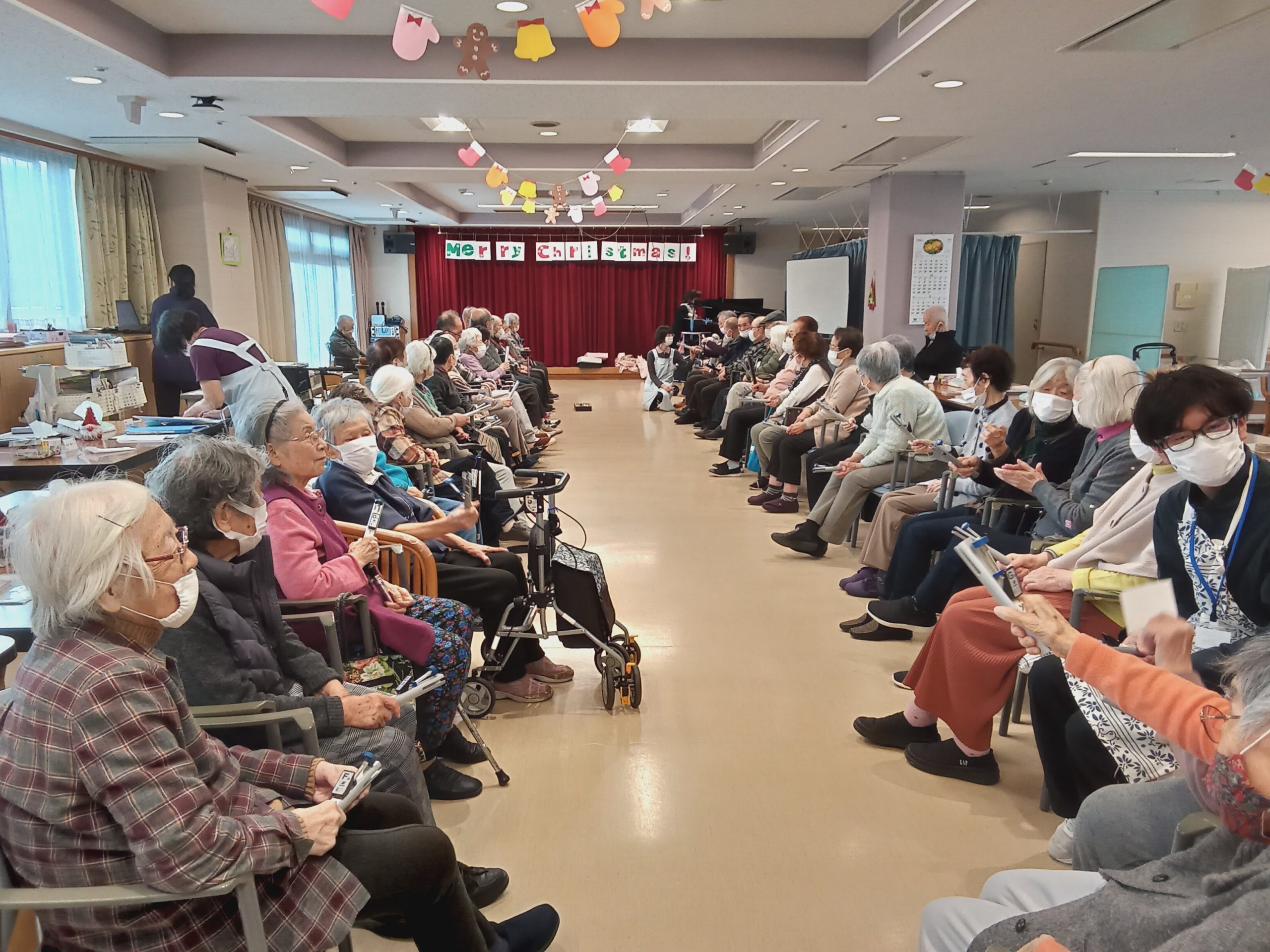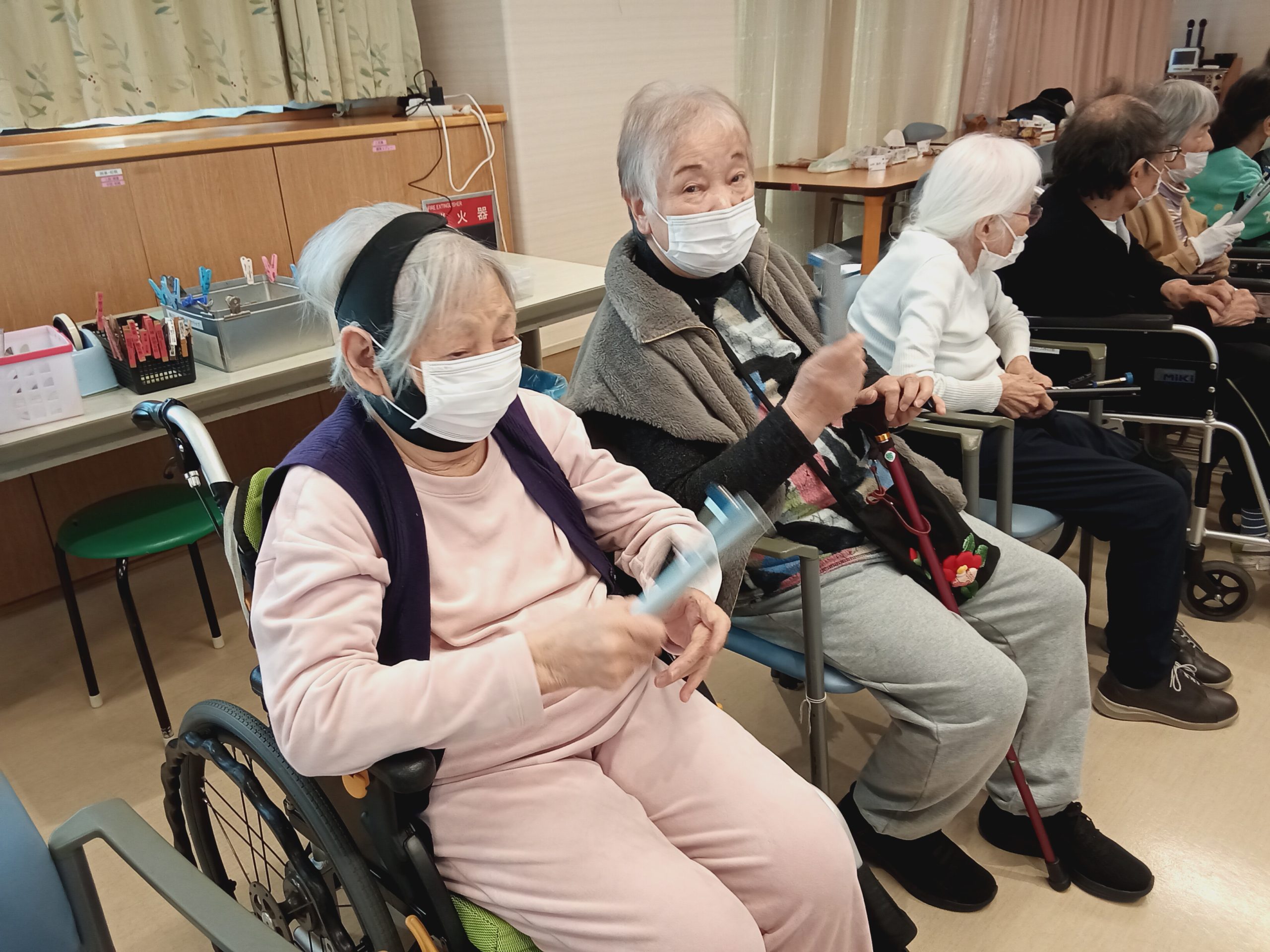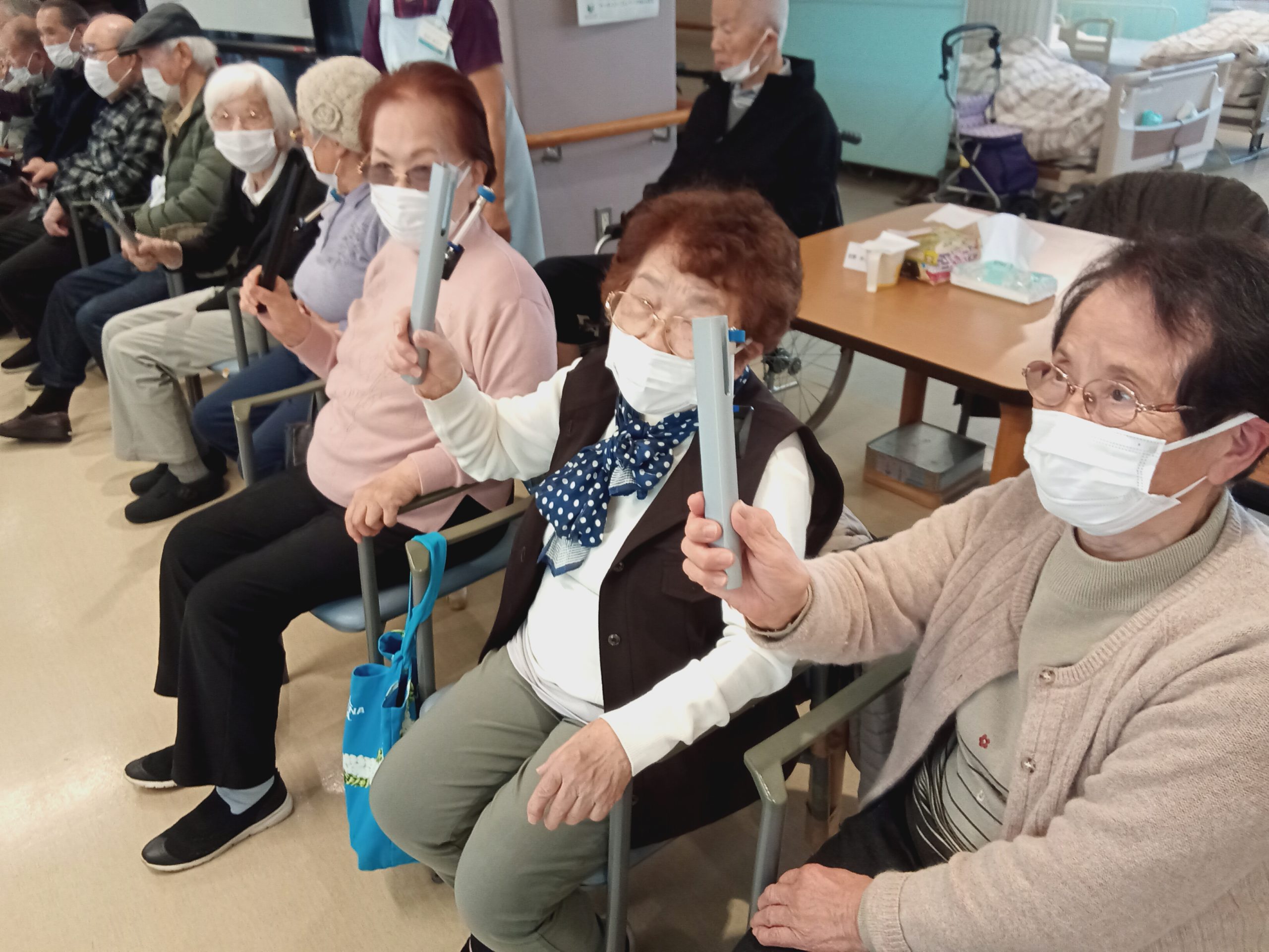 大きな箱を動かしてボールの色と同じ箱の色に入れます。頑張ってと他の方を応援されている様子が見られていました。最後は職員のサックス演奏。たくさんの拍手で盛り上がりました。