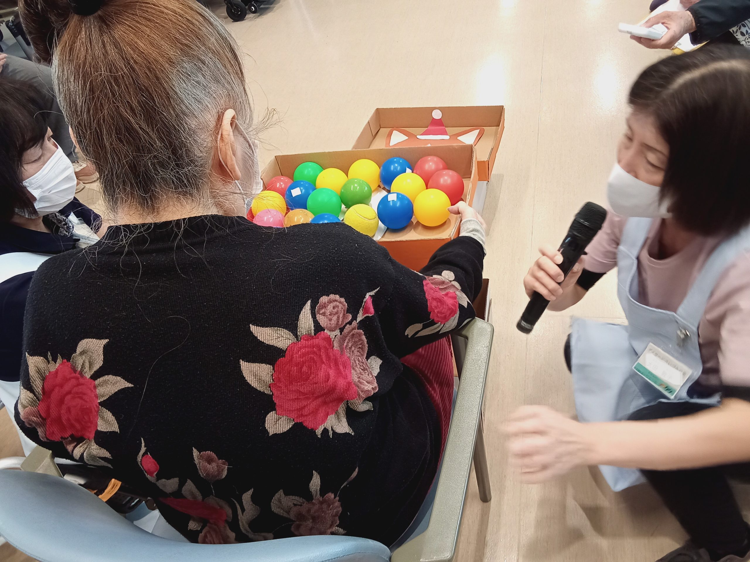 箱の中のボールを落とすだけなのてすが、思っている以上に難しいご様子でした。