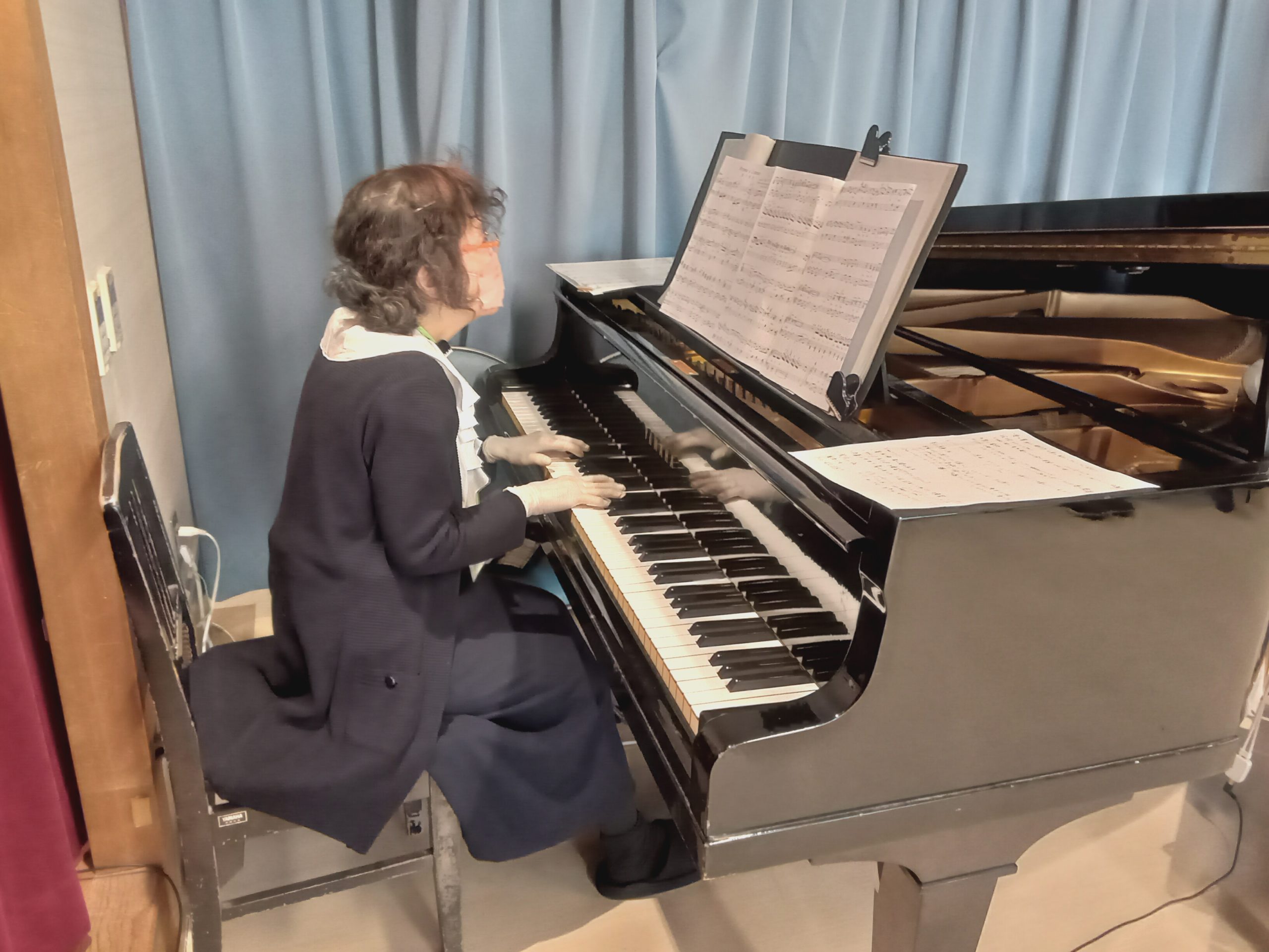 トーンチャイムで【星に願いを】をピアノと一緒に奏でています。