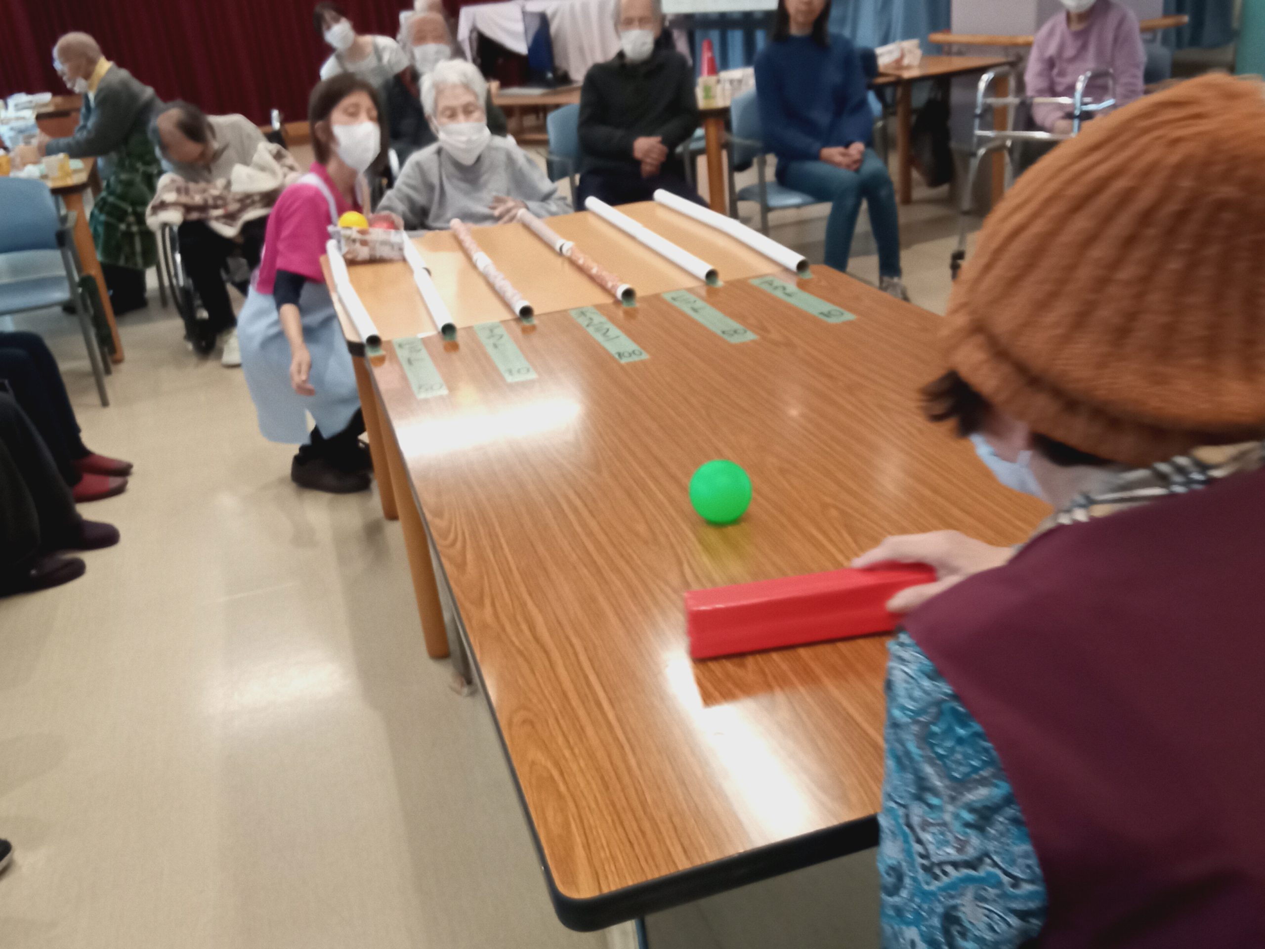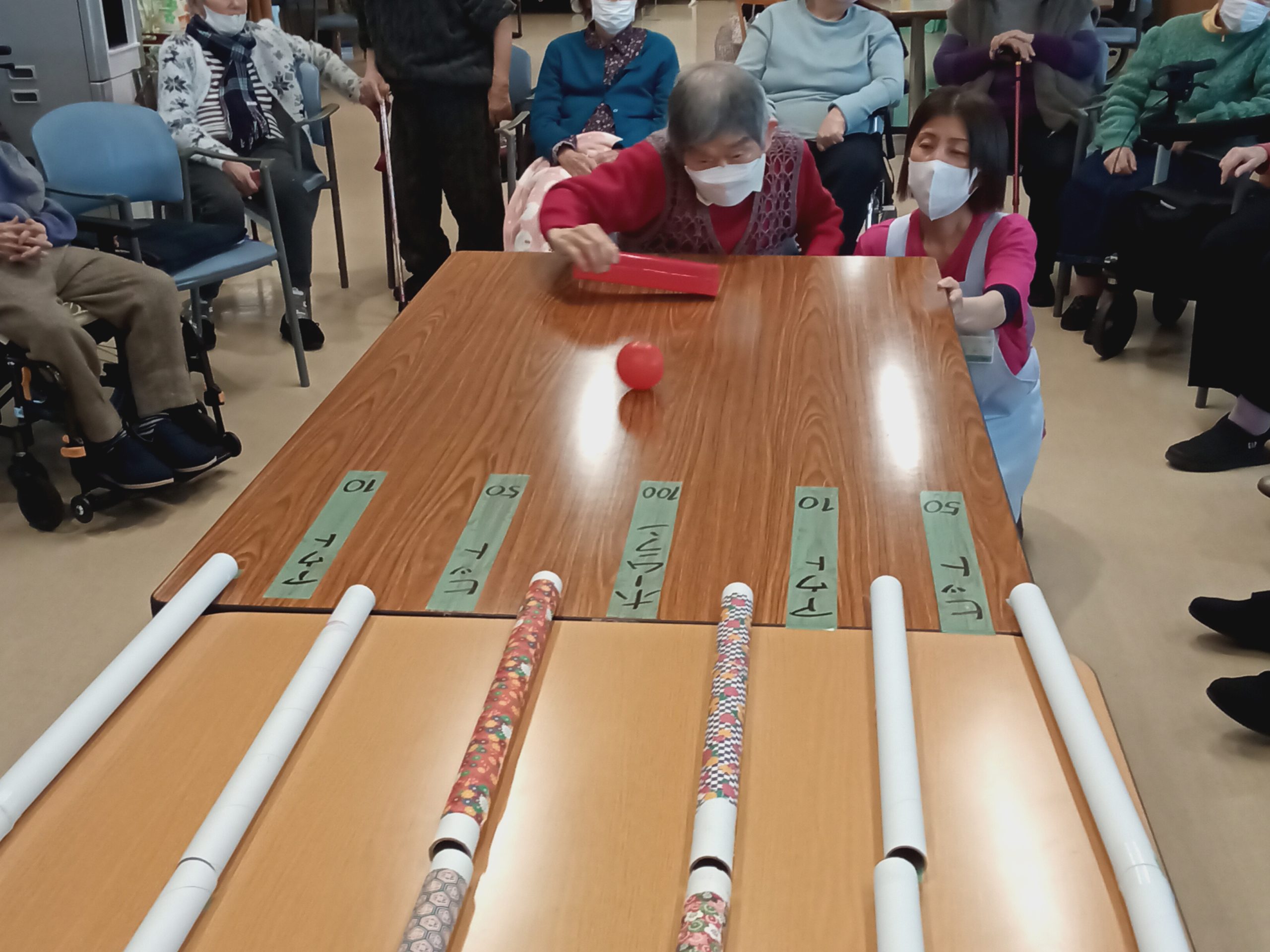 テーブルの上で野球ゲームをしました。ホームラン・ヒット・アウトにそれぞれ点数を付けてボールを打ち競うのですが、1位は最高得点の310点を取られていました。