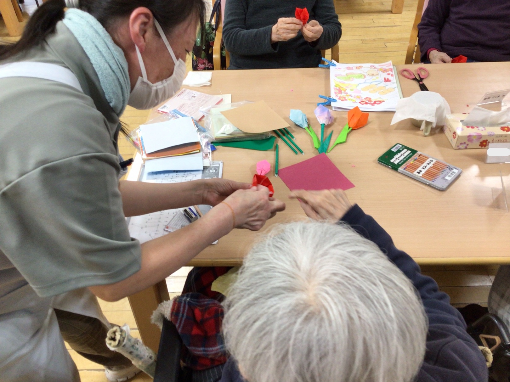 職員の折り紙教室では、「チューリップ」を作成しました。参加されたご利用者は「部屋に飾る」と喜ばれていました。