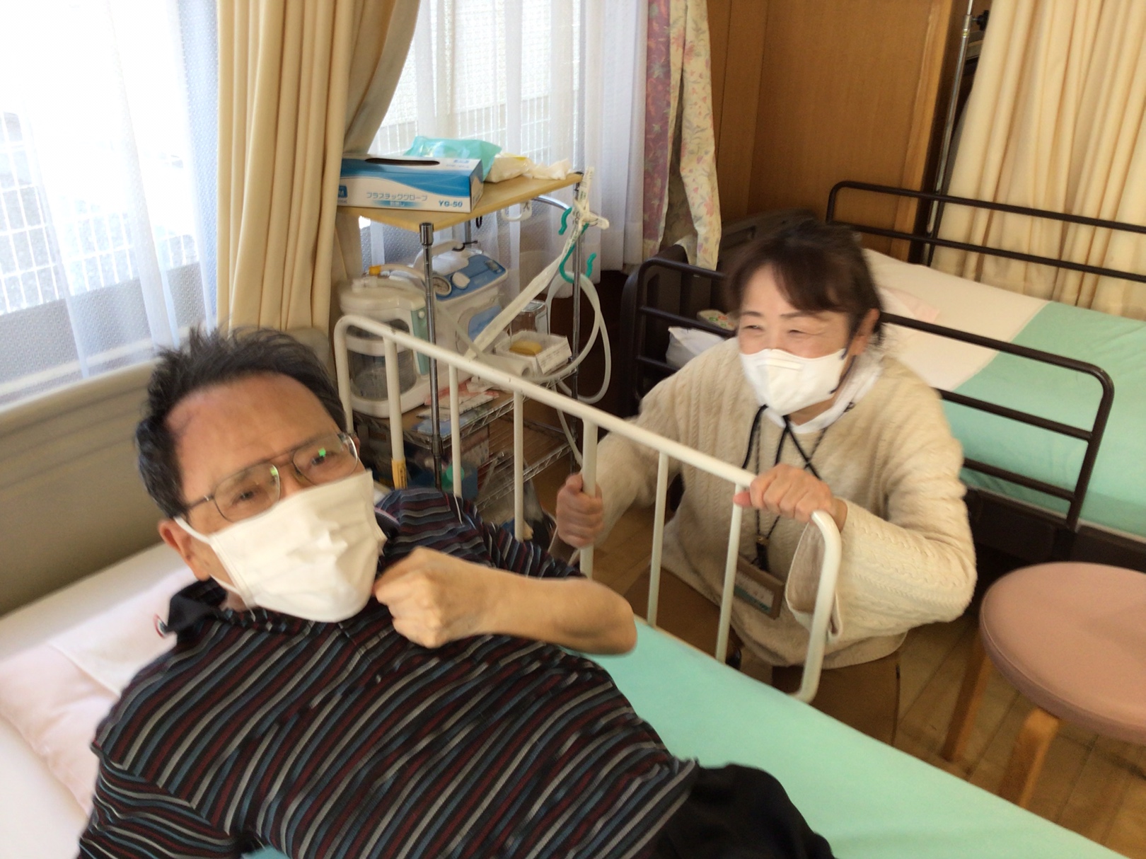ベッドで自主リハビリ中のご利用者にお声掛け。最近のご様子を伺っています。