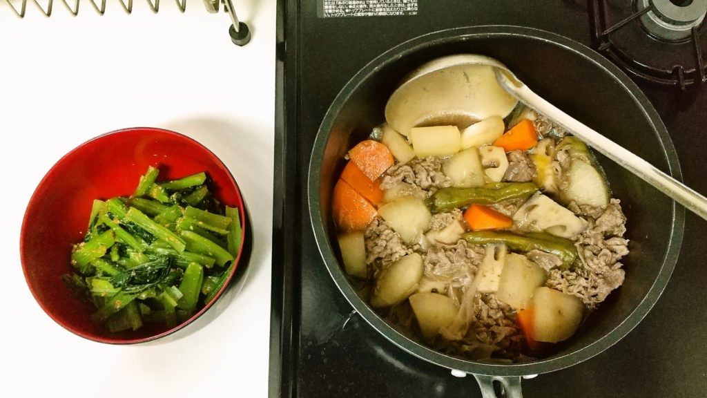ご利用者宅にて、冷蔵庫の野菜室にあった大根、人参、れんこん、ねぎ、ししとう+牛肉を使って煮物を、