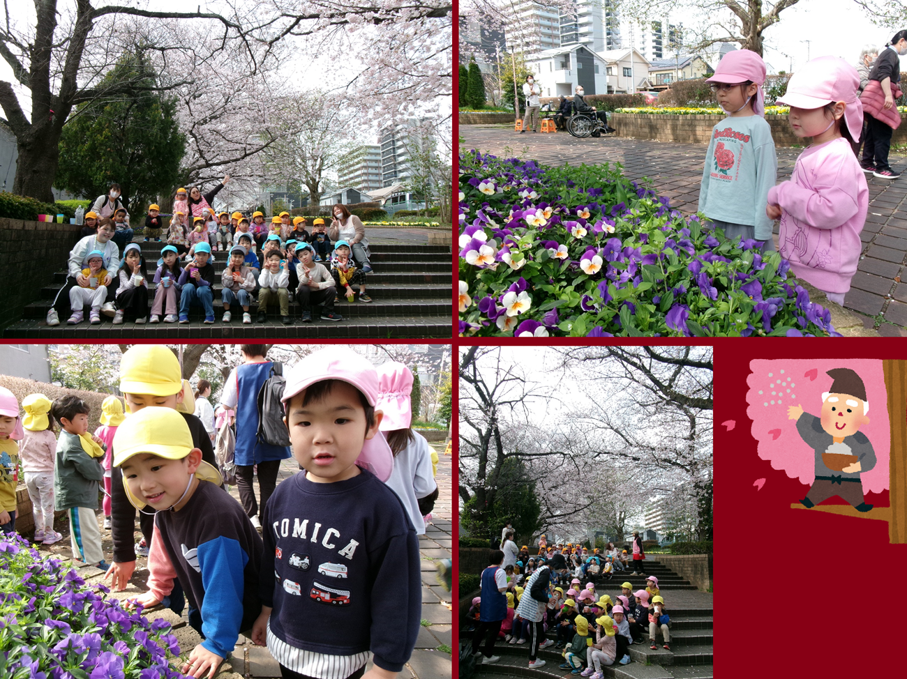 くじら組(5歳児)が芹が谷会館横の桜を見に行くと、ちょうどらっこ組(2歳児)が遊んでいたので一緒にお水を飲みながらお花見です。