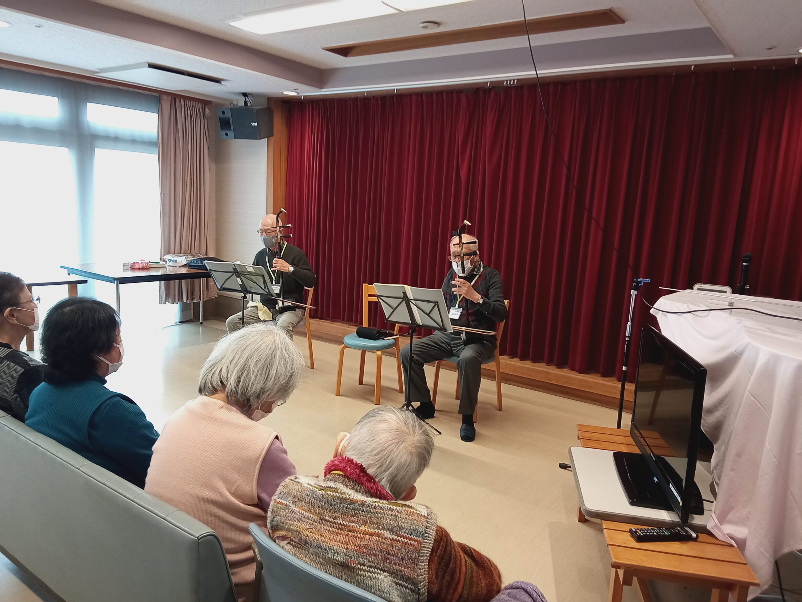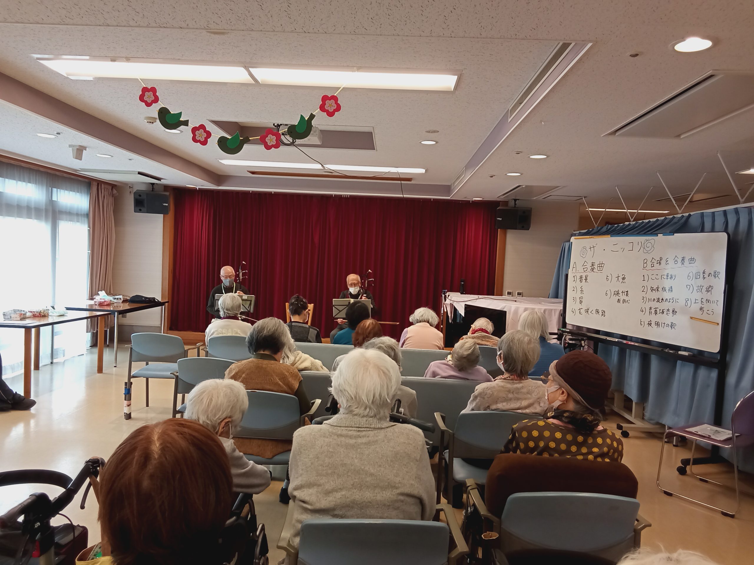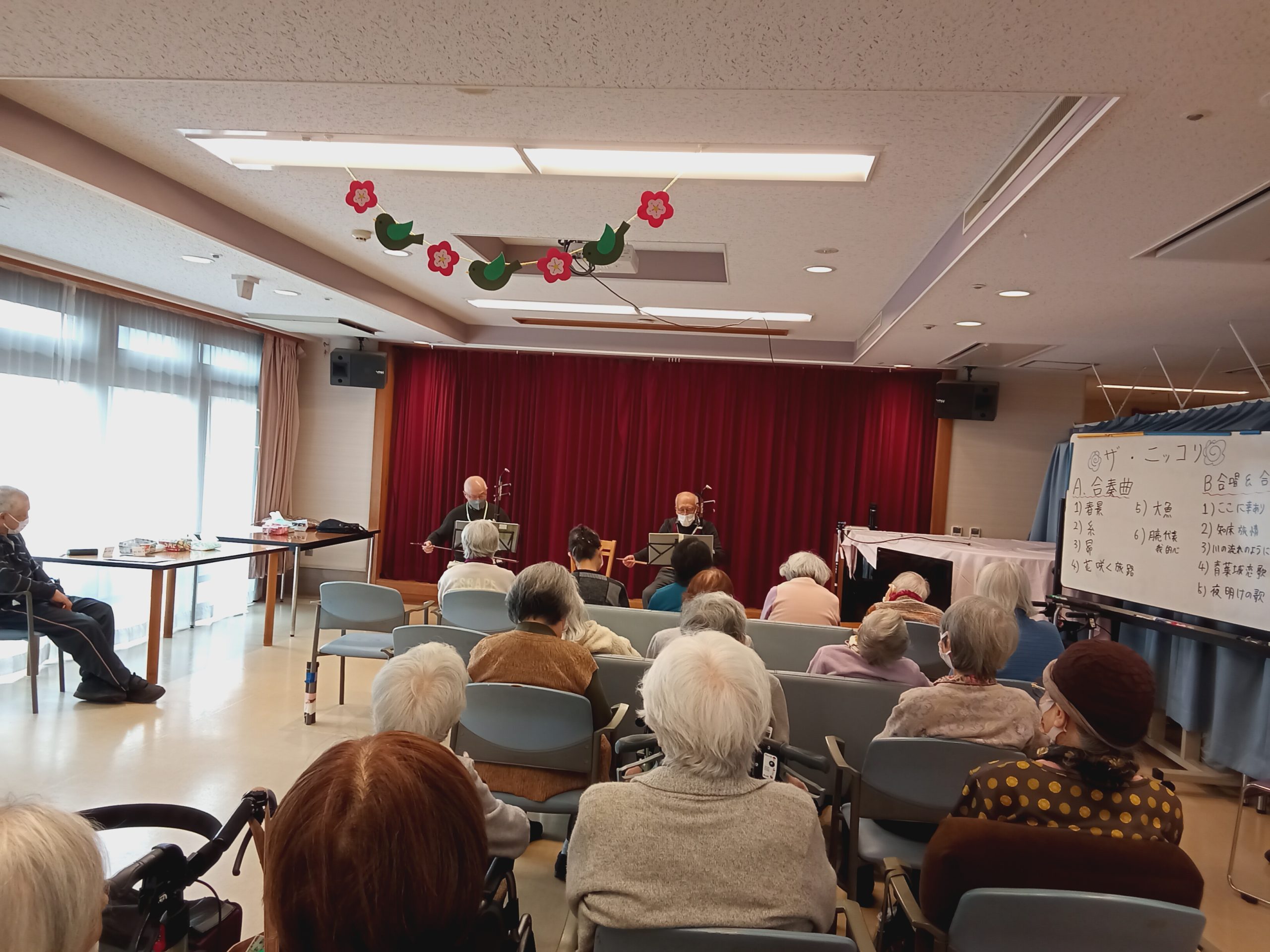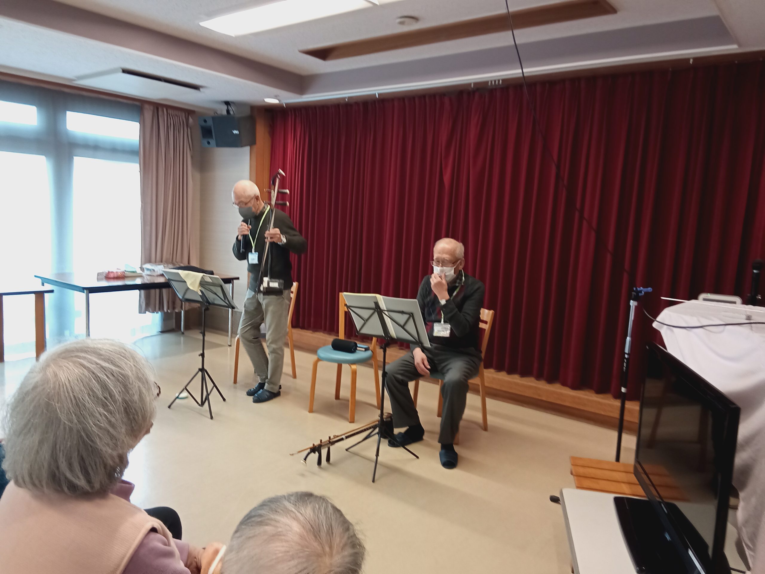 二胡の演奏に合わせ、皆様と歌集を見ながら「ここに幸あり」「知床旅情」「川の流れのように」を歌いました。優しく響く音色と歌声に、心温まる充実した時間となりました。