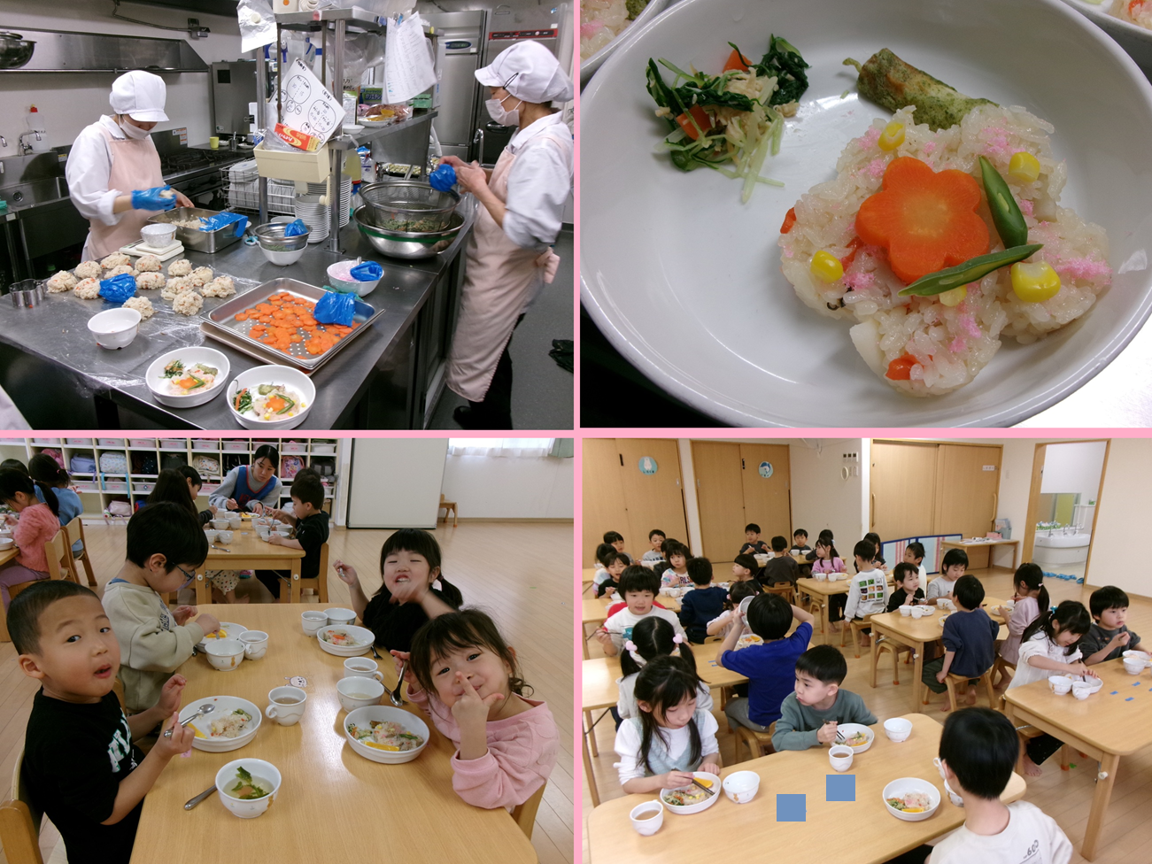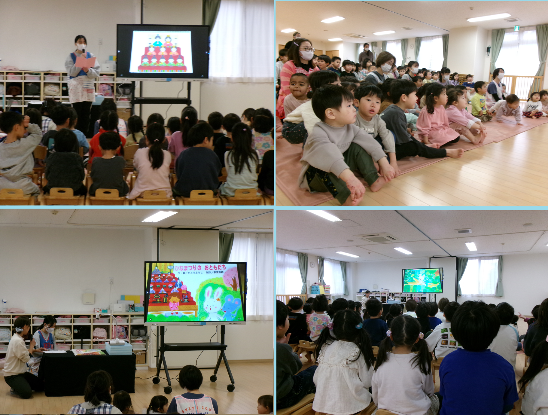 変化したひなまつり人形の間違い探しや紙芝居を見て行事について知りました。