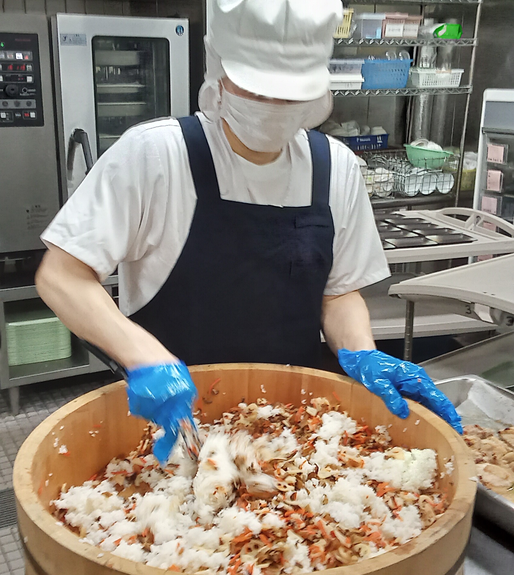ちらし寿司は大きい寿司桶を使って具材を混ぜ込みました。この寿司桶、長らく倉庫で大事にしまっていたため袋から出すと木の良い香りがします。ちなみに、本日は約100人分のちらし寿司を用意するため、ご飯を寿司桶に移して具材を混ぜ込む作業は2回行ないました。また、「卵豆腐のわさびあんかけ」は備蓄品を使用しています。昨今は備蓄品のフードロスも問題になっているため、いづみの里では期限が近くなった備蓄品を献立に取り入れてフードロス削減に努めています。そのままでも食べられますが、わさびあんかけで辛みを加えて口直しになるようにしました。
