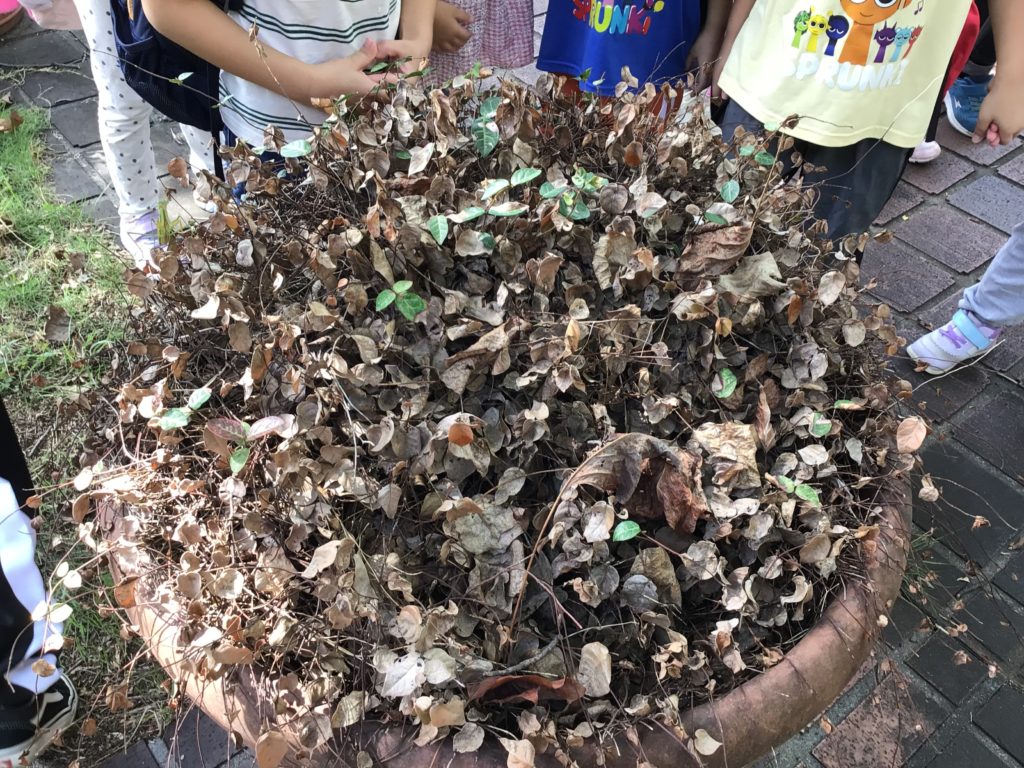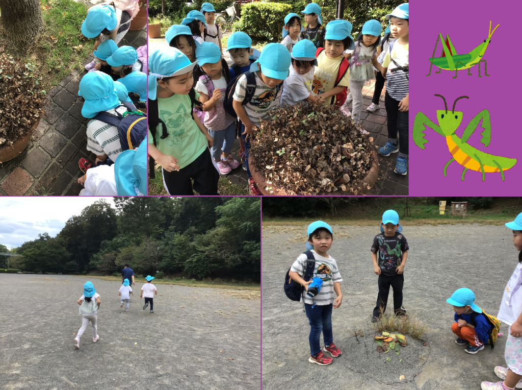 くじら組が公園の入り口で大きなバッタとカマキリに遭遇しました。