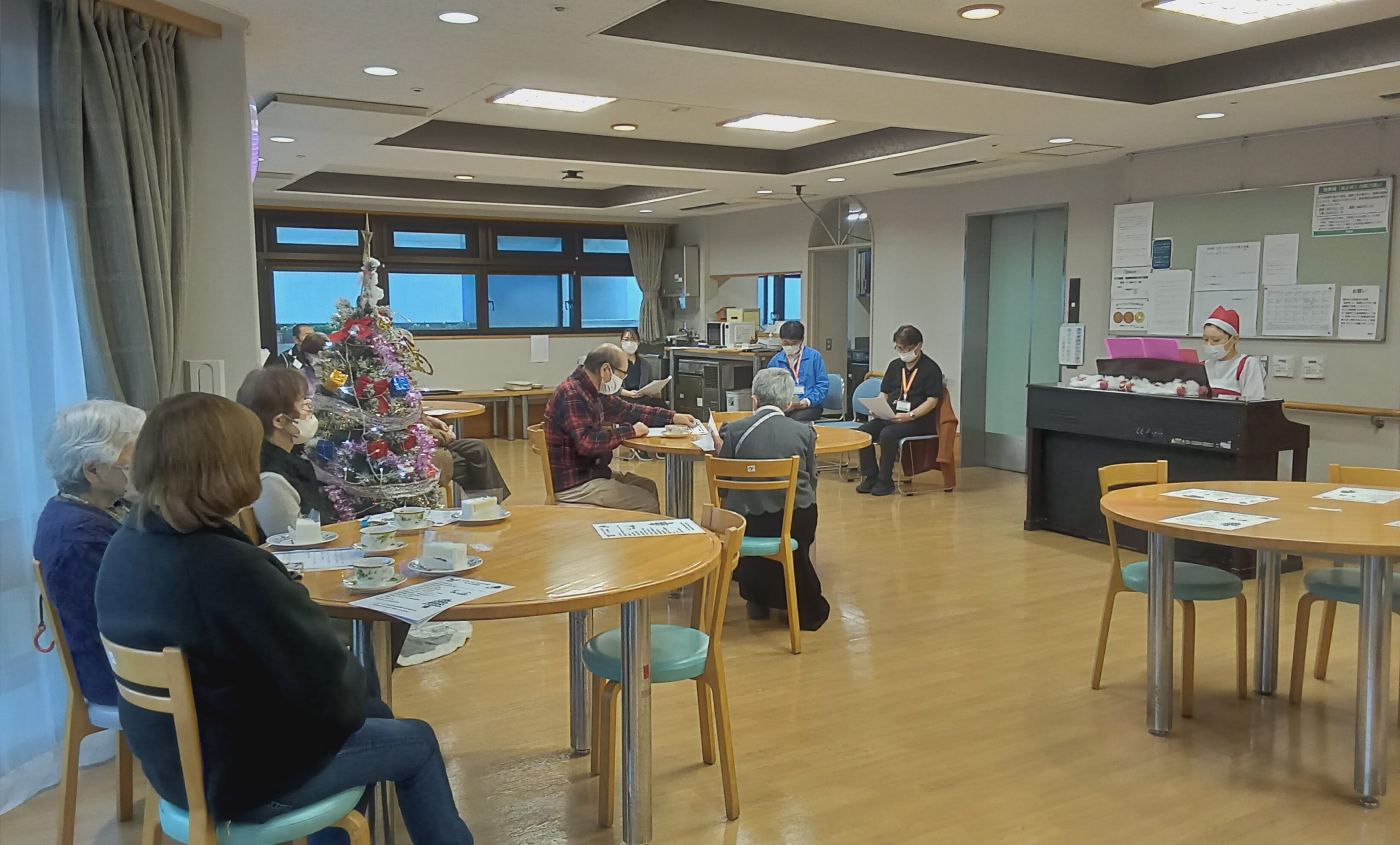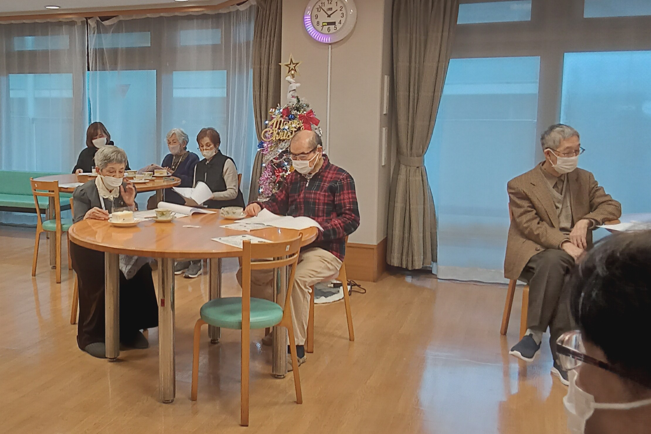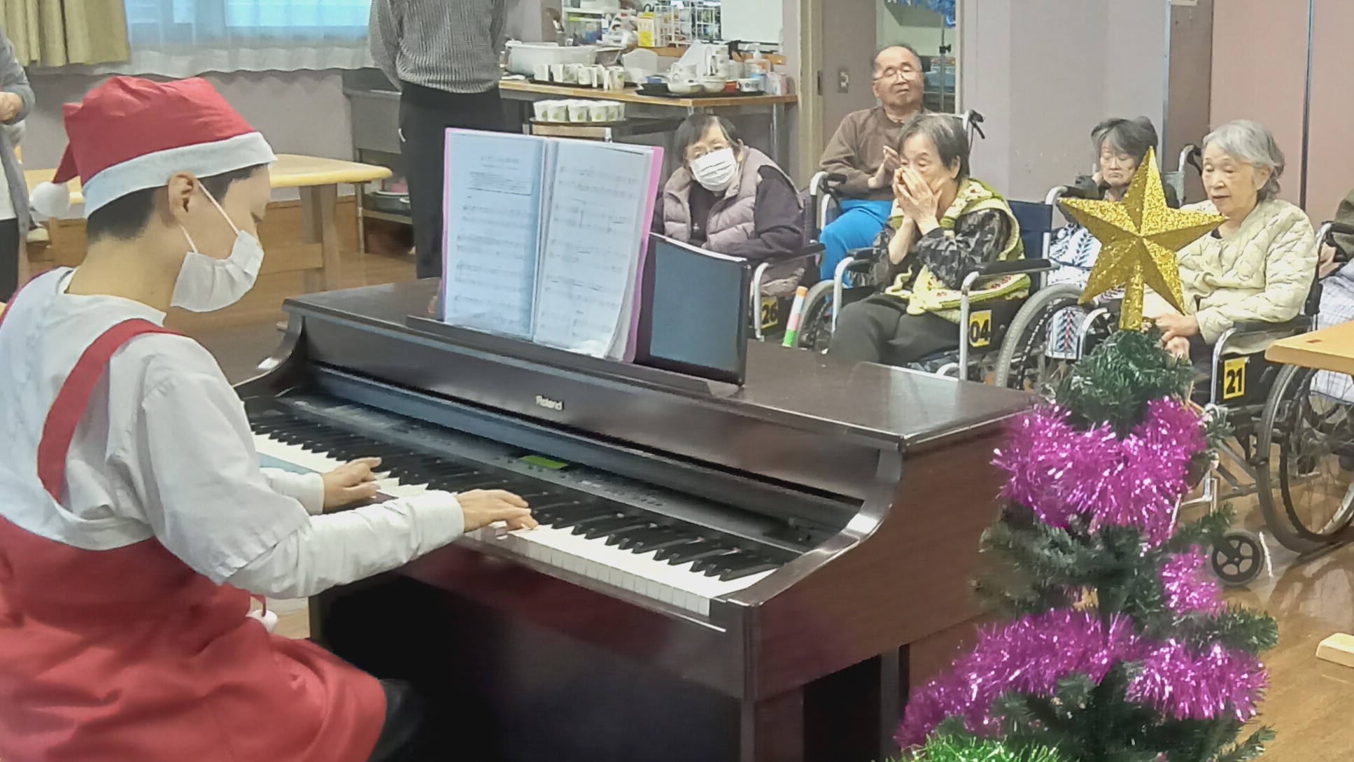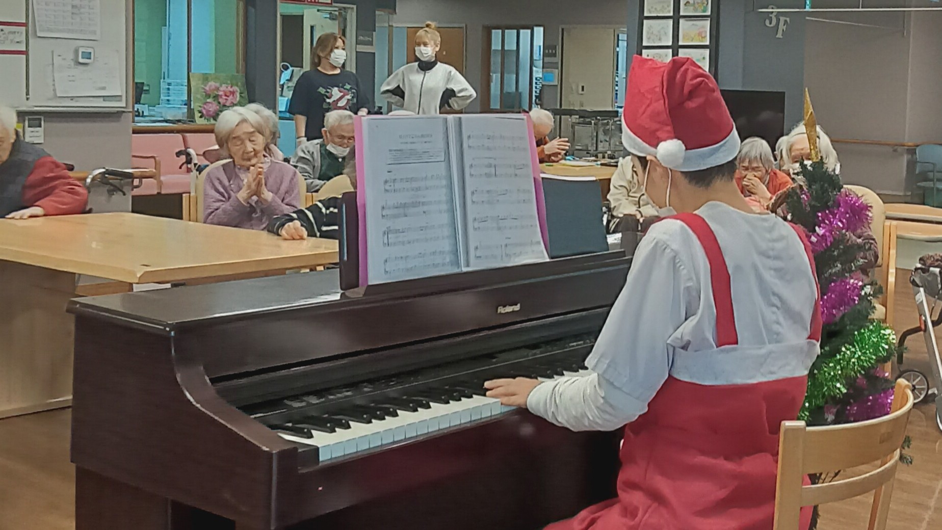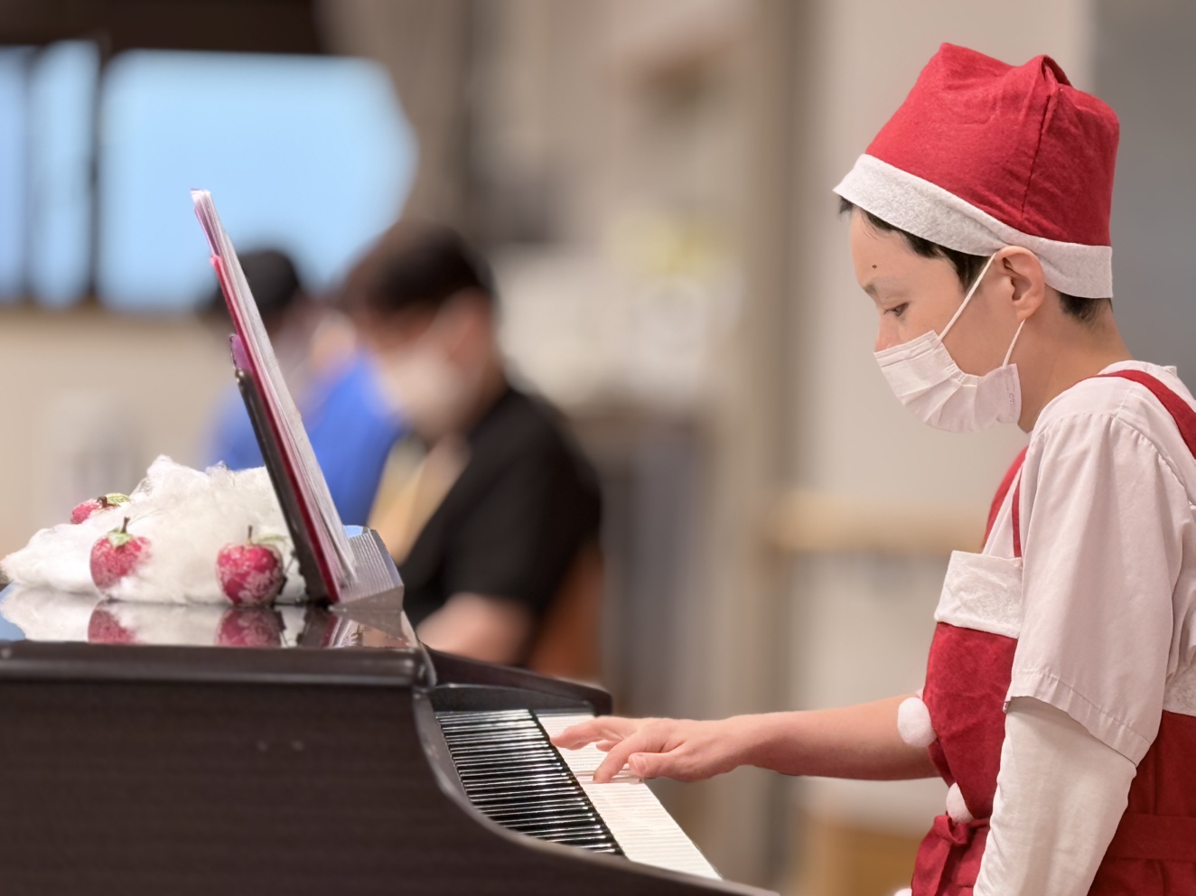 職員によるピアノ演奏が会場に響く中、皆さまにはケーキを召し上がっていただき、ゆったりとしたひとときを過ごしていただきました。クリスマスの曲を数曲演奏すると、口ずさまれたりする姿も見られ、終始和やかな雰囲気に包まれていました。