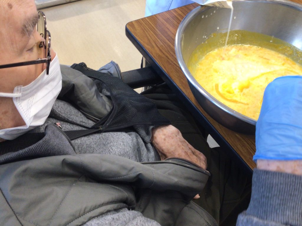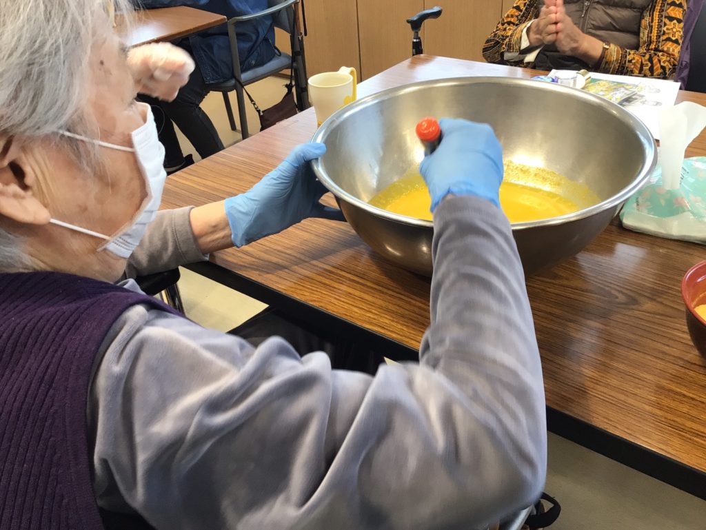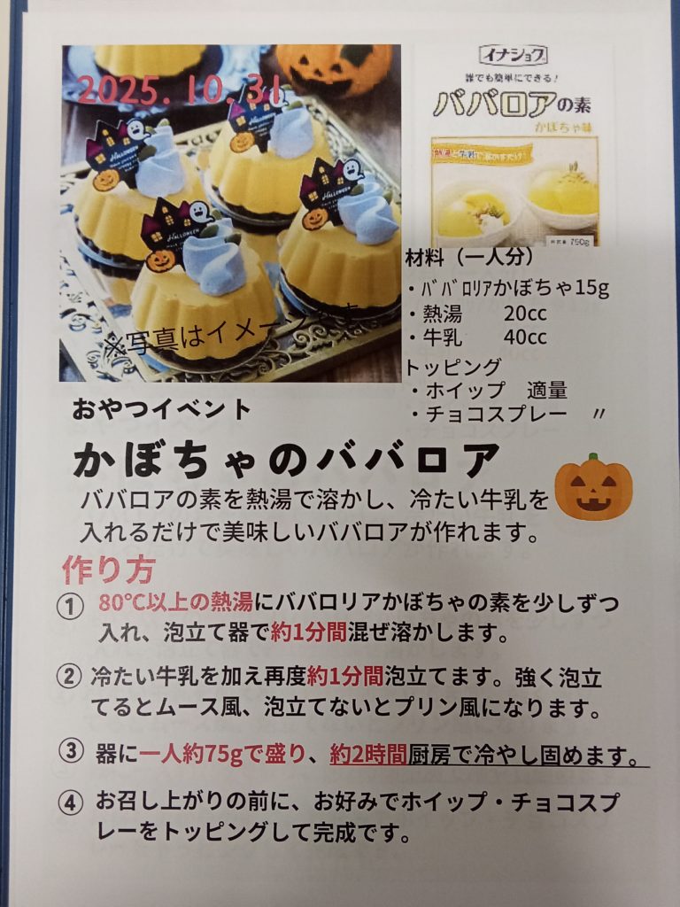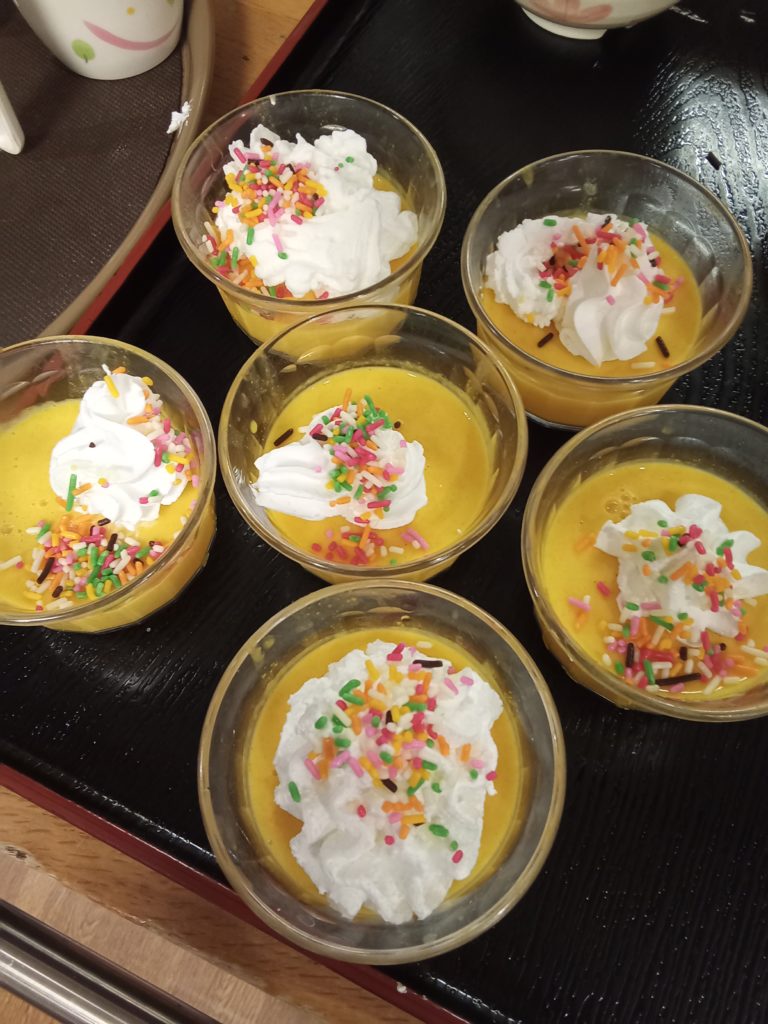 今月のおやつイベントは、ハロウィンにちなんで『かぼちゃのババロア』作りを行いました。ババロアの素を熱湯で溶かし、冷たい牛乳を入れて混ぜ、冷蔵庫で冷やすだけで美味しいババロアが作れます。午前中にババロアを各フロアで作り、おやつの時間にホイップクリームとチョコスプレーをお好みでかけてお召し上がりいただきました。