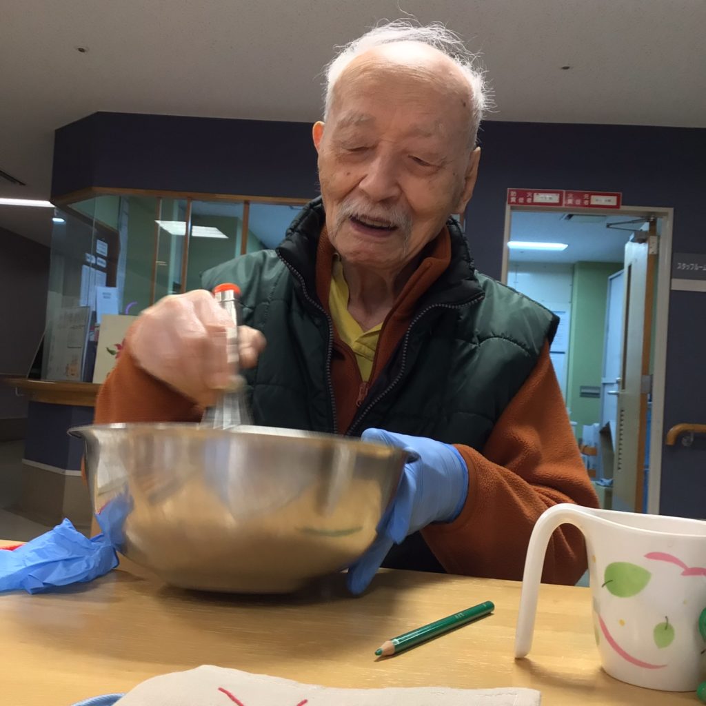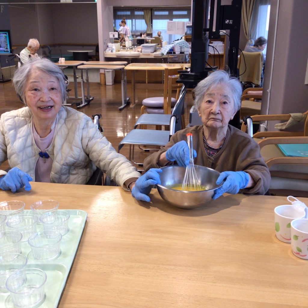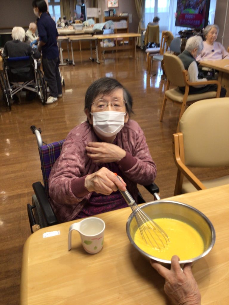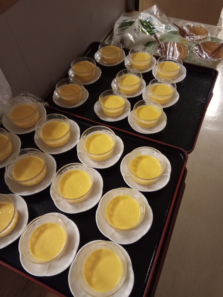 今月のおやつイベントは、ハロウィンにちなんで『かぼちゃのババロア』作りを行いました。ババロアの素を熱湯で溶かし、冷たい牛乳を入れて混ぜ、冷蔵庫で冷やすだけで美味しいババロアが作れます。午前中にババロアを各フロアで作り、おやつの時間にホイップクリームとチョコスプレーをお好みでかけてお召し上がりいただきました。