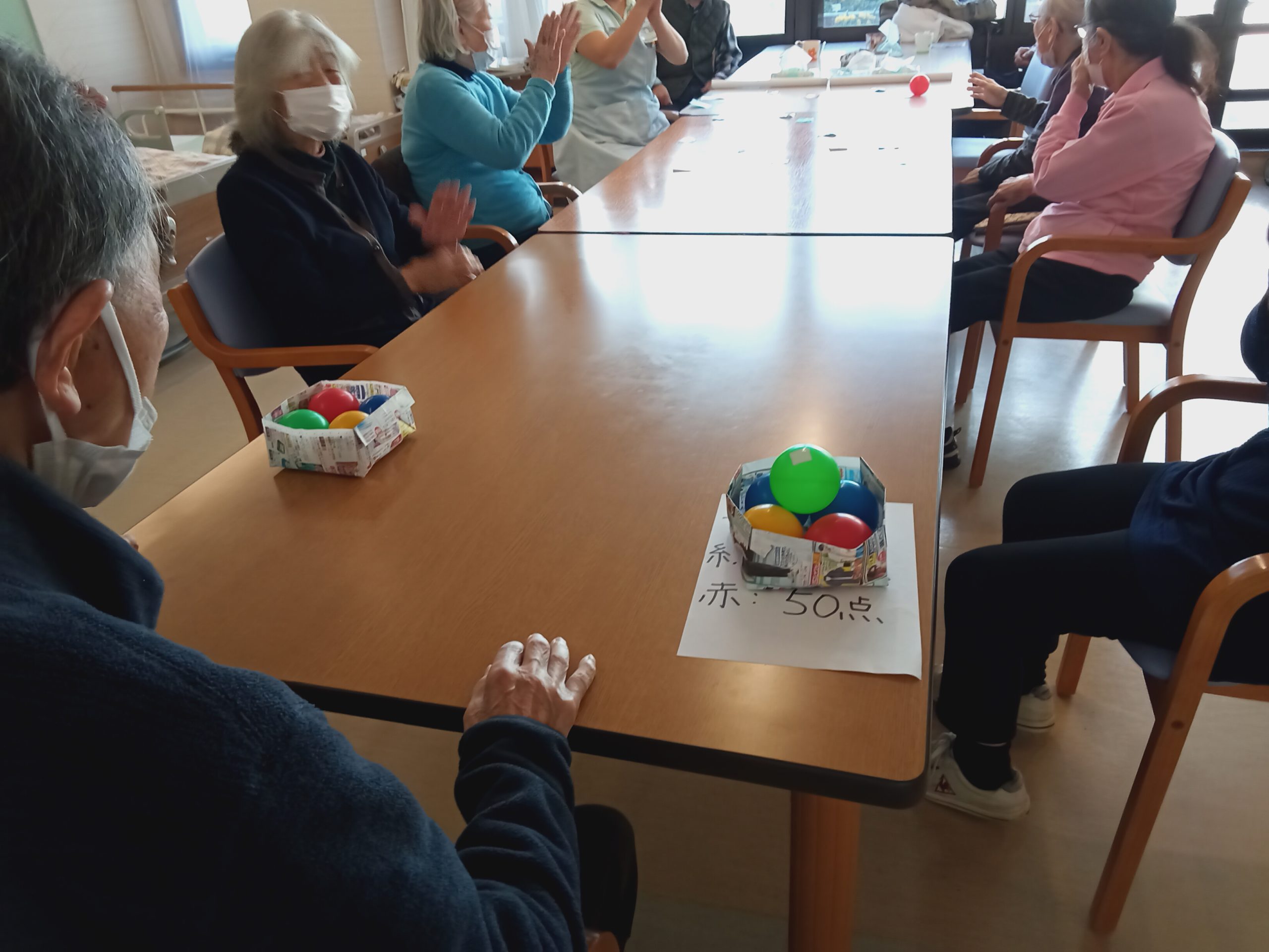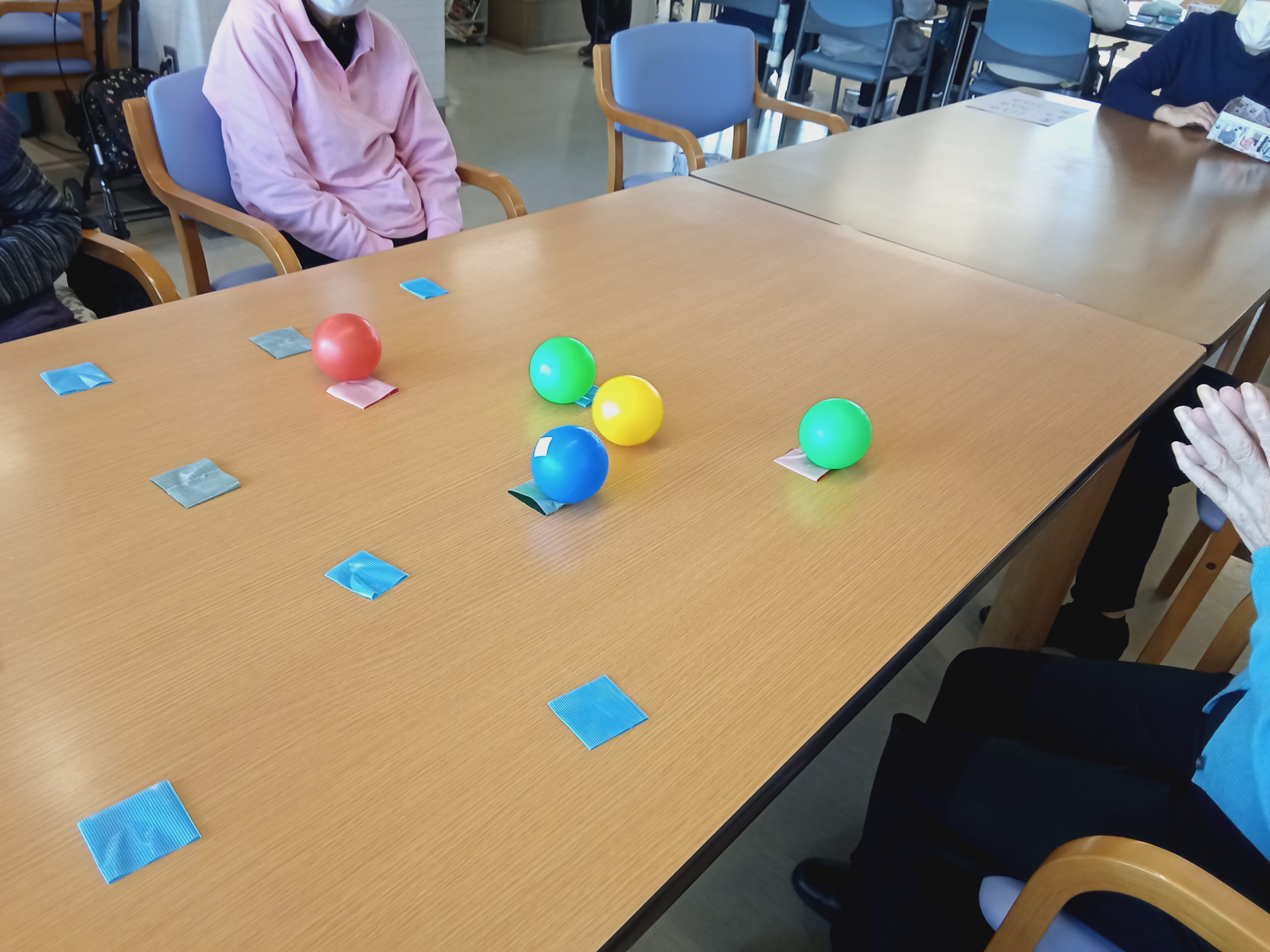 テーブルにガムテープの裏を貼り付け、その上にボールを転がしてくっついた数を競いました。上手に出来た時は拍手と笑いがたくさんありました。