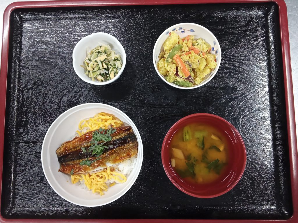 10/6は「秋刀魚の蒲焼丼」を提供しました。本日は中秋の名月なので、秋らしいメニューにしました。秋刀魚は開きのものを購入し、小麦粉をまぶしてパリッと焼き上げました。仕上げに蒲焼のタレと山椒をかけて完成です。今年は秋刀魚が手に入りやすく、いづみの里でも何度か提供する予定です。