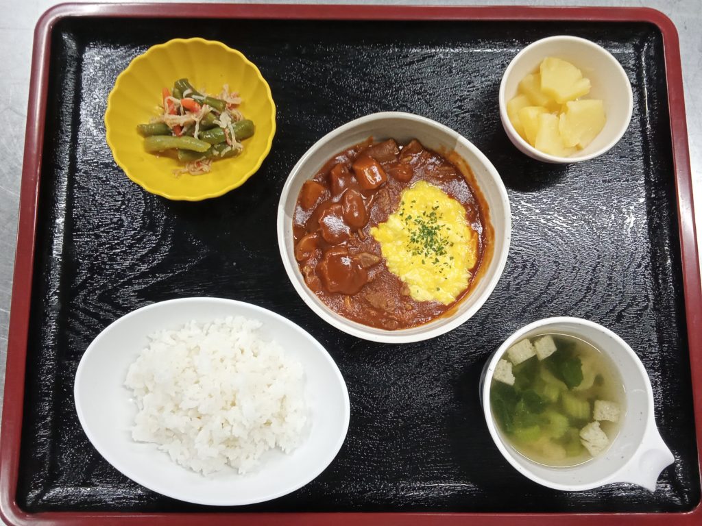 10/9は「ハッシュドビーフ」を提供しました。ハッシュドビーフと似た料理にハヤシライスがあり、何が違うのか気になって調べたところ、ハヤシライスがトマトソースを使用して甘めに仕上げているのに対し、ハッシュドビーフはデミグラスソースをベースに大人向けの味付けになっているそうです。いづみの里でもデミグラスソースをベースにしていますが、ご飯に合うようケチャップ等を加えました。