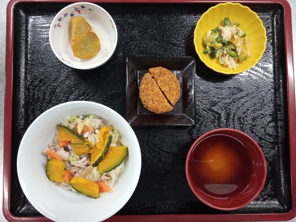 11/3は「ほうとう風うどん」を提供しました。山梨の郷土料理である「ほうとううどん」の最大の特徴は平たいうどんです。せっかくなら平たいうどんを使いたいと探しましたが、残念ながら今回は見つからず、いつものうどんを使いました。うどんは違いますが、南瓜がたっぷりと入っており、ほうとうの雰囲気は感じていただけたのではないでしょうか。