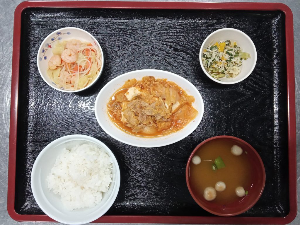 11/17の主菜は「白菜と厚揚げのキムチ煮」でした。本日はキムチを2kg使っています。キムチはメーカーによって味が異なるため、今回は2種類のキムチをミックスして使ってもらいました。程よい辛みと酸味で食が進む味付けに仕上がりました。今週は徐々に寒さが厳しくなってくるようなので、温かい料理を準備して皆様をお待ちしています。
