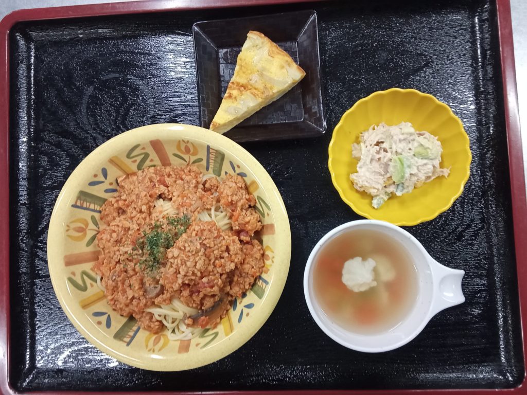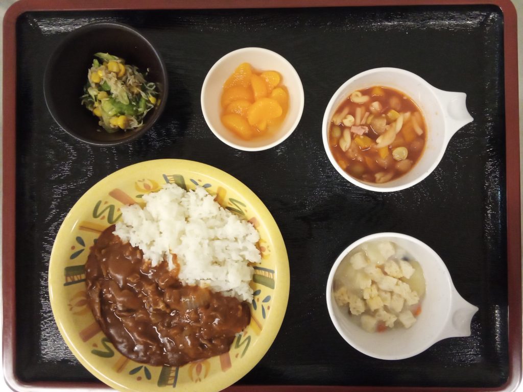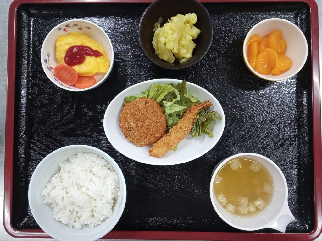 11/24は洋食メニューを提供しました。ミックスフライにオムレツ、フルーツとお子様メニューのような献立ですが、意外とこういった献立が好まれるようで、残菜が少ないです。ちなみに、ミックスフライは業者のおすすめ品を使うことが多いため、そのときによって内容が異なります。本日はチーズ入りメンチカツとエビフライの2種類を組み合わせました。調理師は揚げるのにつきっきりで大変そうでしたが、ちょうどよい色づきで見た目も食欲をそそる出来になりました。