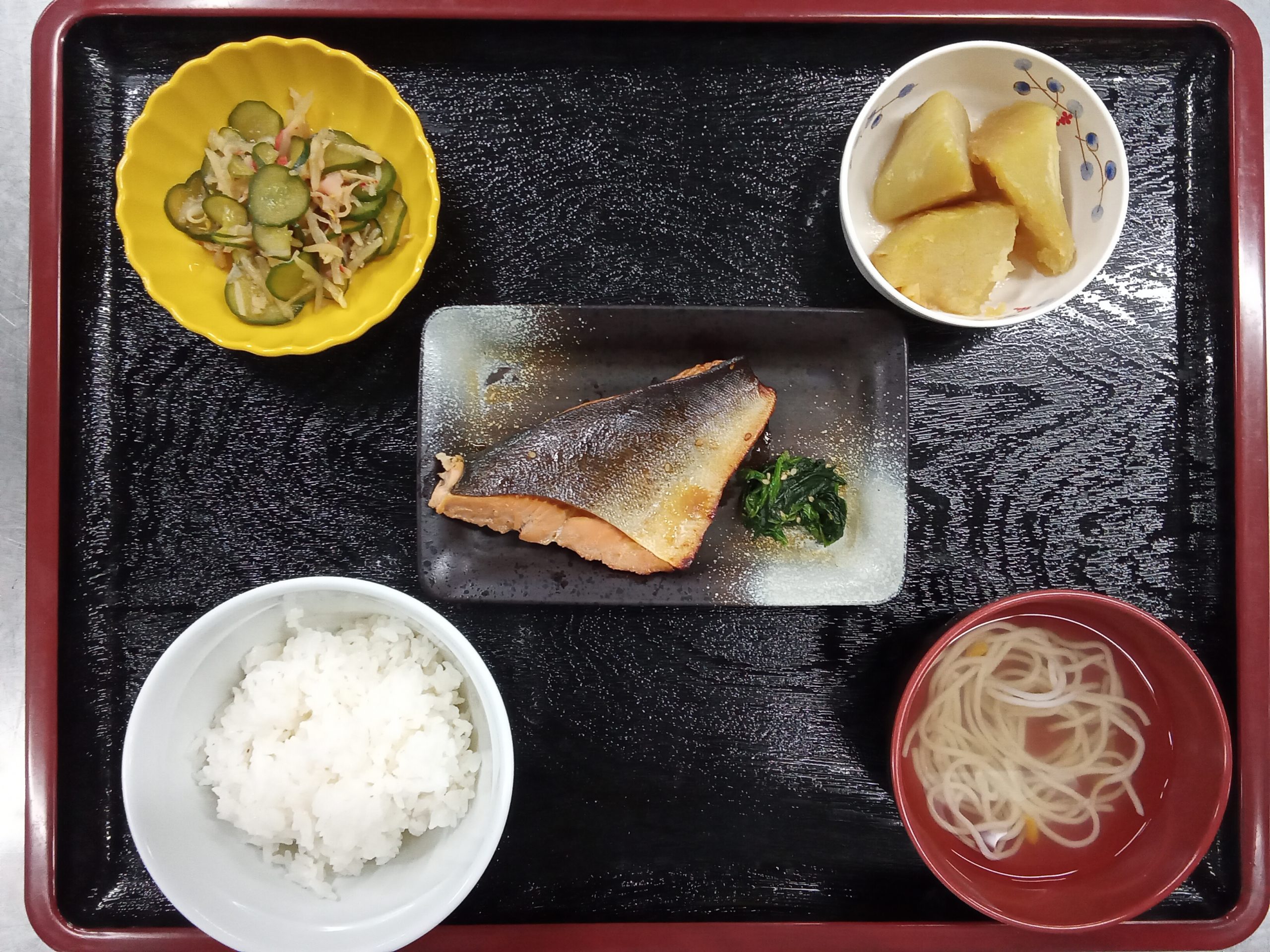 11/28の温菜は「さつまいもの甘煮」でした。本日のさつまいもは柔らかく崩れやすかったため、スチームコンベクションで蒸し煮にしました。さつまいも自体が甘かったため、蒸し煮でちょうどよい味加減になりました。普段はおかずを残しがちな方も、さつまいもはペロリと召し上がっていました。