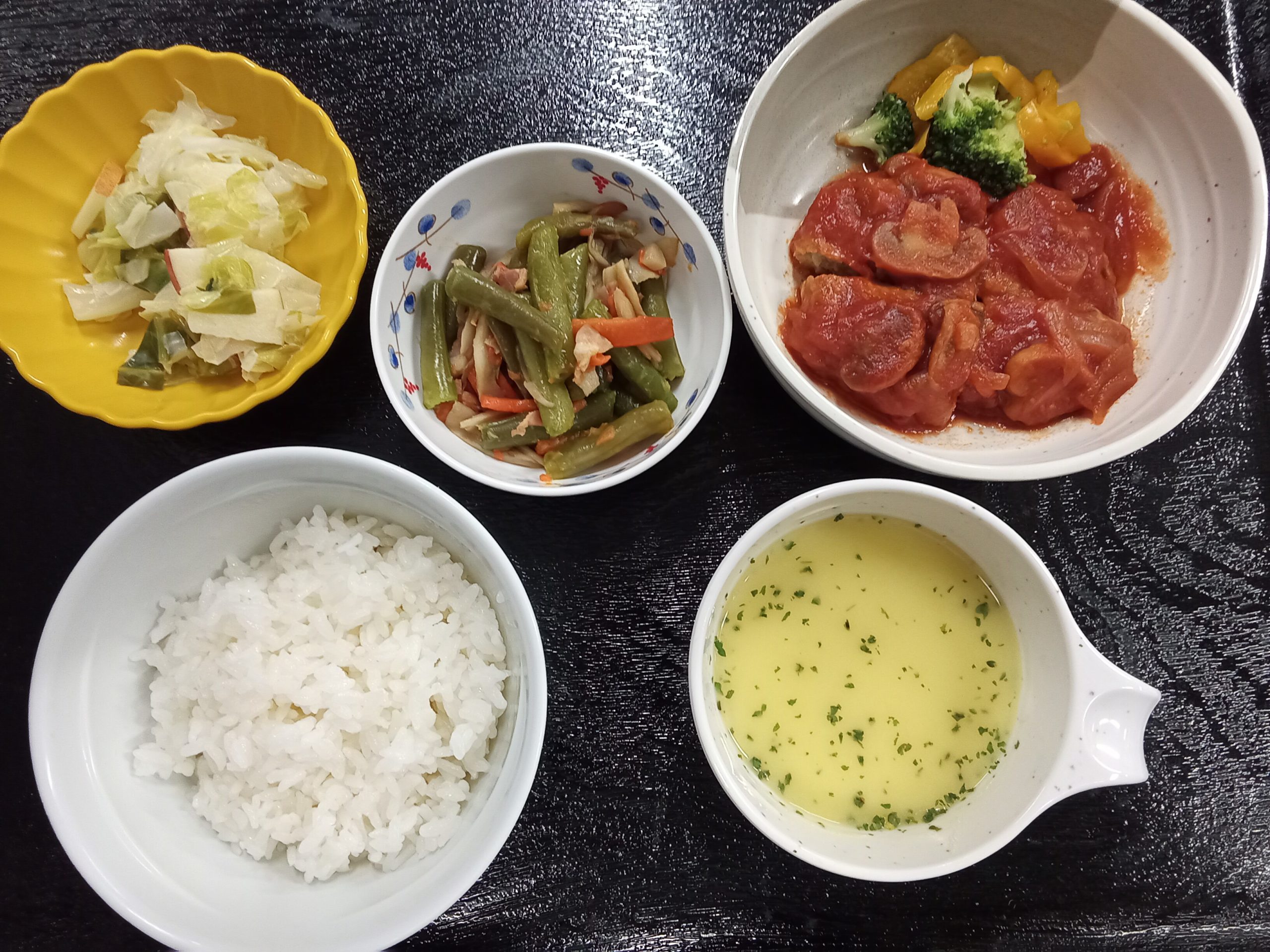 12/1の主菜は「鶏肉の蜂蜜照り焼き」でした。砂糖の代わりに蜂蜜を使っており、いつもの照り焼きより甘みが強くなっています。そのため、副菜はピリ辛味噌にしたり、沢庵和えにしたりと味の変化を楽しめるようにしました。