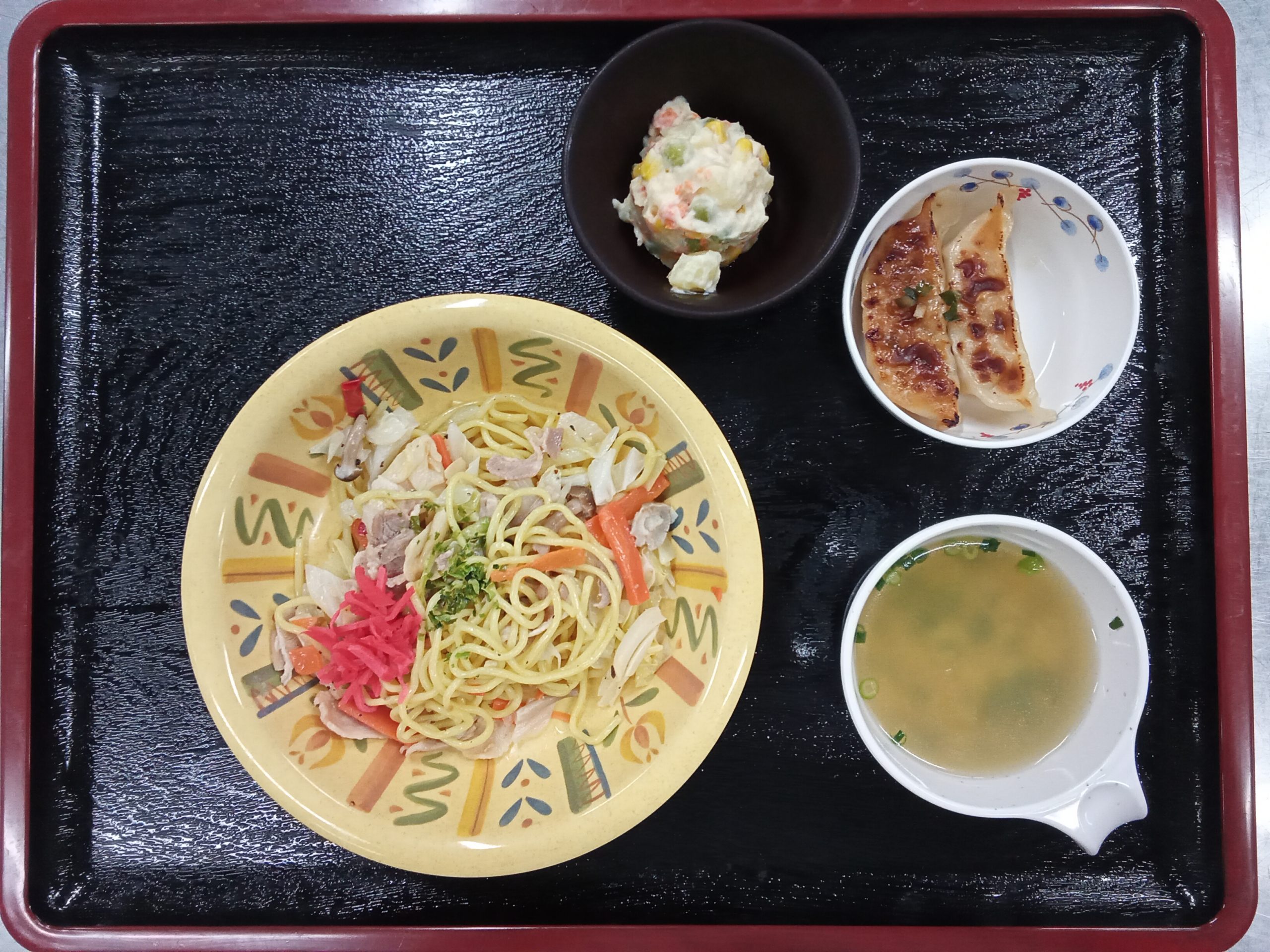 12/3は「塩焼きそば」を提供しました。焼きそばは味付けでムラが出やすいため、味付き麺を使用しています。そこに、白だしで味付けした豚肉とキャベツ、人参、しめじを加えて完成です。焼きそばは他の麺類と異なり具材がすでに混ざっているため、麺と具材を均一に盛り付けるのが難しいです。そのため1度盛り付けた後、麺と具材のバランスを見て足したり減らしたりといった微調整をしています。