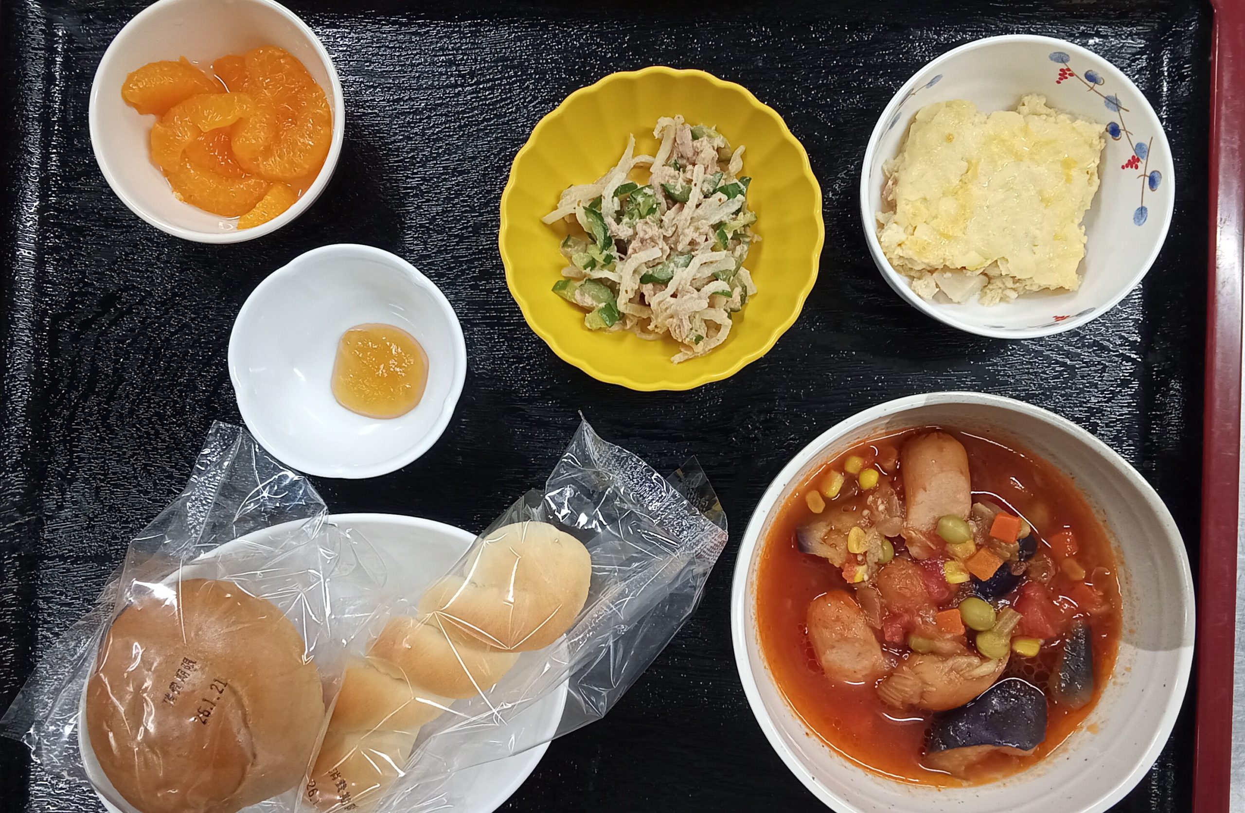 1/19の温菜は「きのこのキッシュ」でした。本日はパンセレクトで普段のようにご飯を炊かなくてよかった分、調理師に余裕があったのでキッシュを作ってもらいました。キッシュと聞くと高カロリーなイメージがありますが、おからを使ったためエネルギーを抑えることができました。