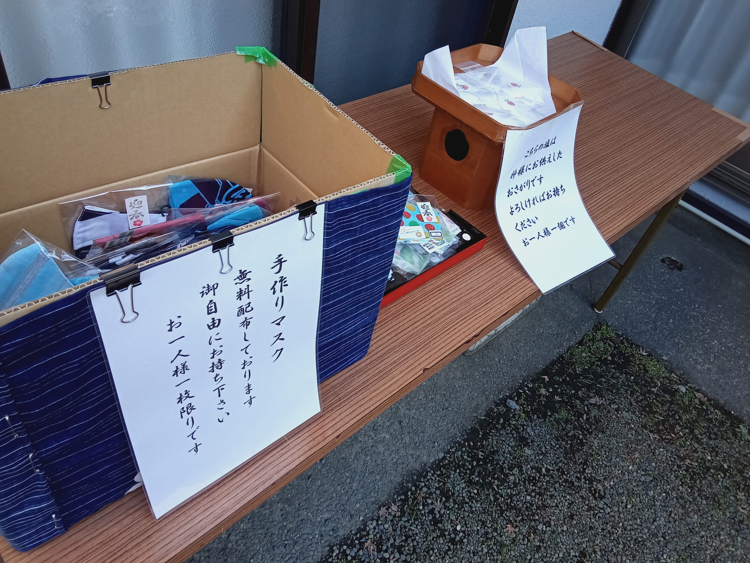 『手作りのマスク』『お清めのお塩』ひとつひとつ丁寧に作られたマスクを手に取ると、作り手の方の温かさが伝わってくるようです。お清めのお塩もいただいたので、さっそく家を清めて、良い運気をたくさん取り込みたいと思います。