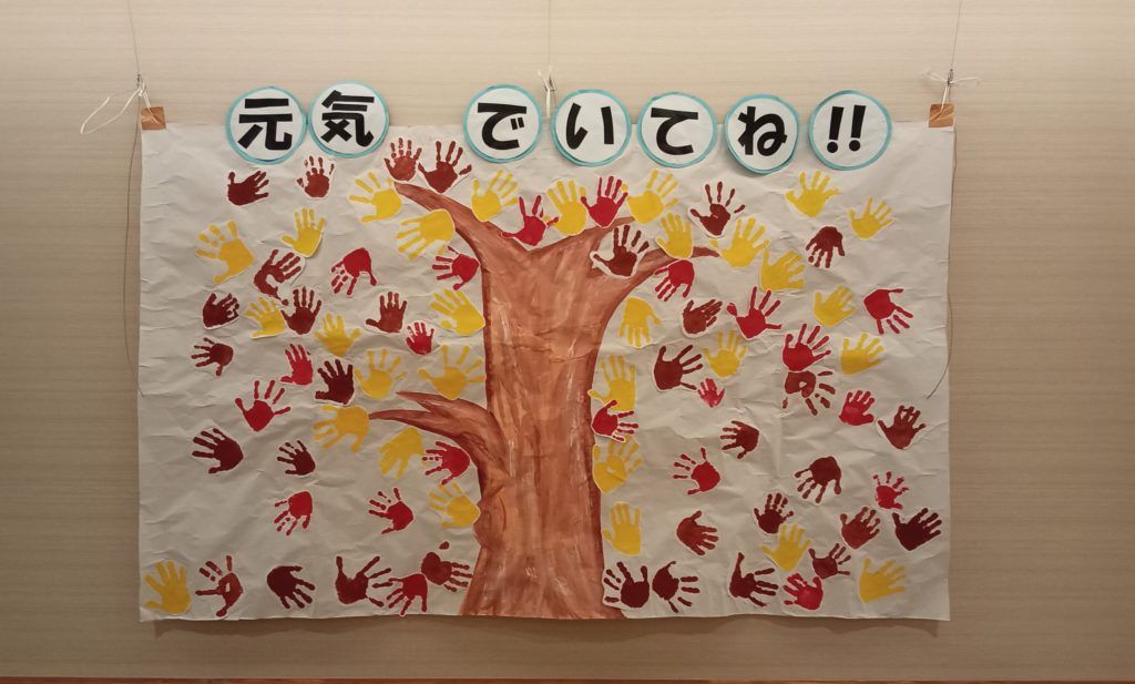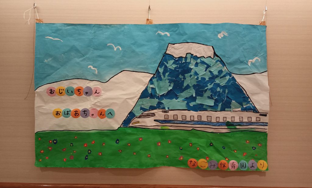 いづみの里1階の廊下に、なごみ保育園・なごみ第二保育園の園児が制作した作品が飾られています。こちらは園児からご利用者へ送られた作品で、9月に開催された敬老祝賀会でもご参加いただいた皆さまへ作品紹介をさせていただきました。園児たちが力を合わせて作った力作ですので、いづみの里にお越しの際は是非ご覧になってください。