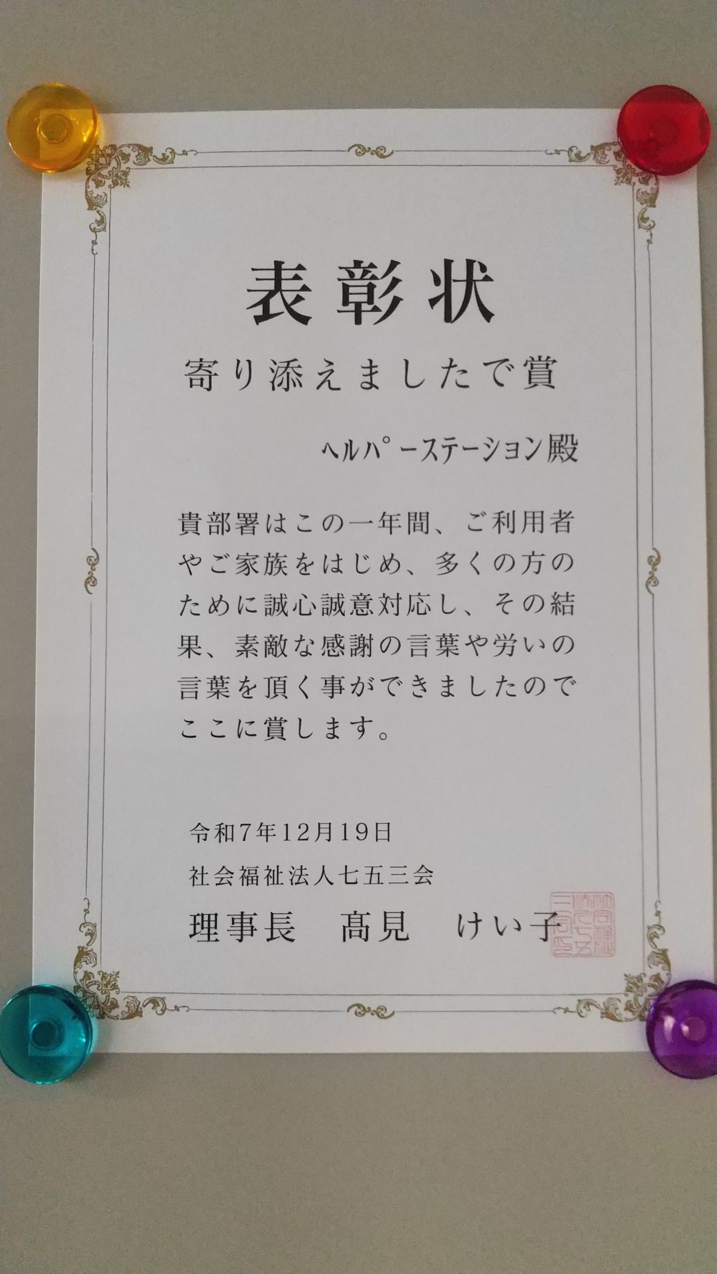 七五三会から「寄り添えましたで賞」をいただきました。