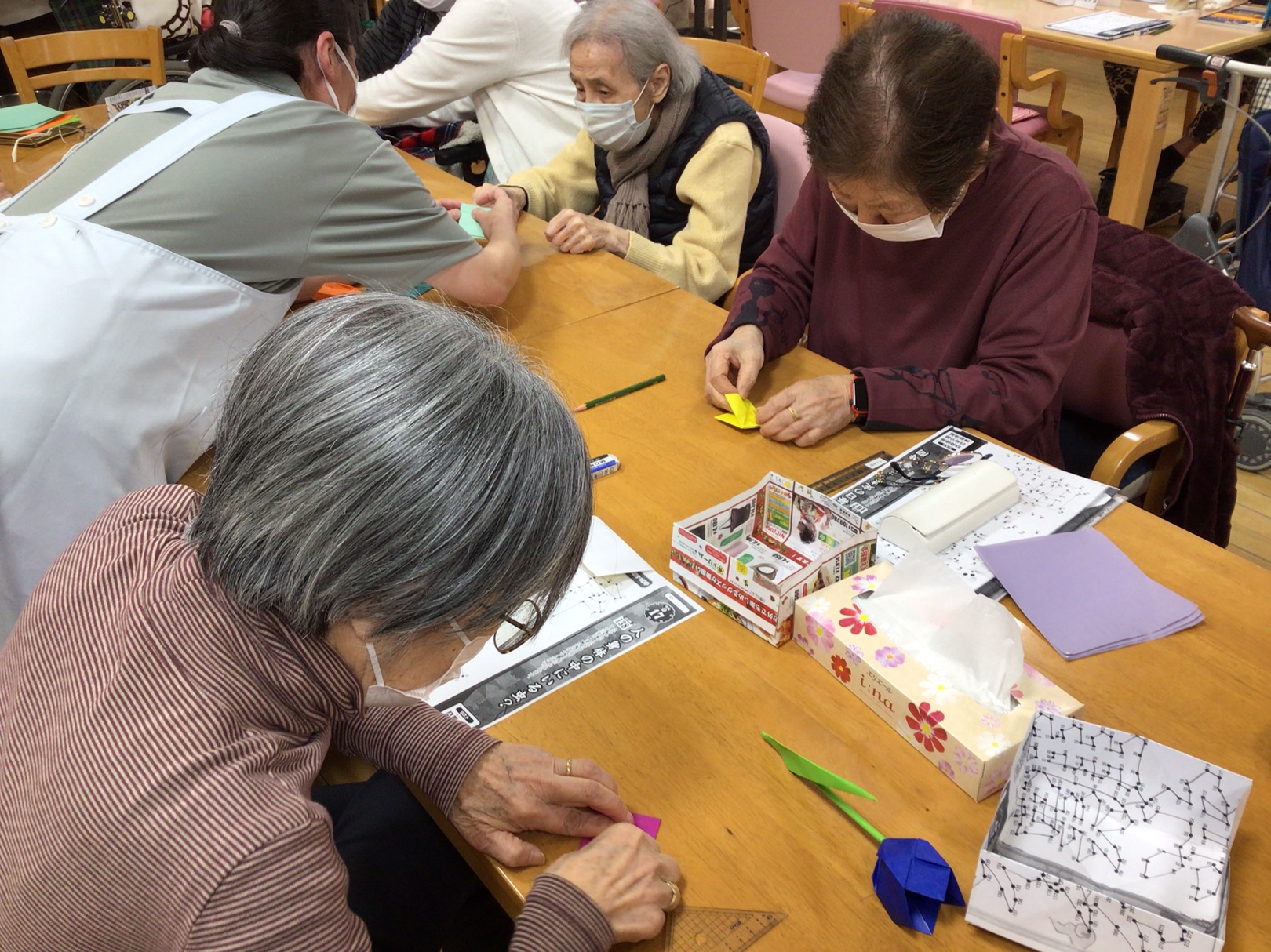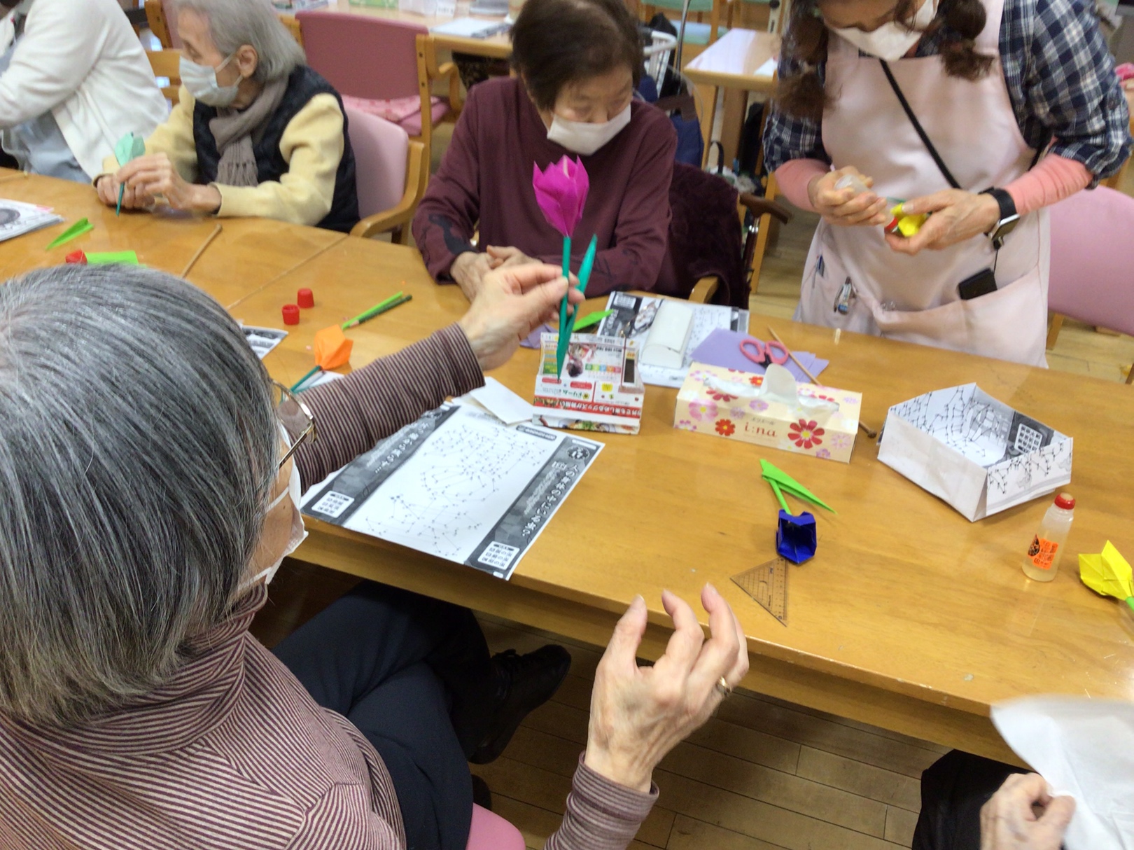 職員による折り紙教室でチューリップを作りました!春が待ち遠しいです。