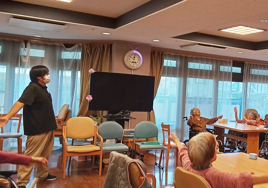いづみの里特養では、毎日 朝の体操を行っています。職員と一緒に入居者の皆さまも音に合わせて身体を動かされていました。