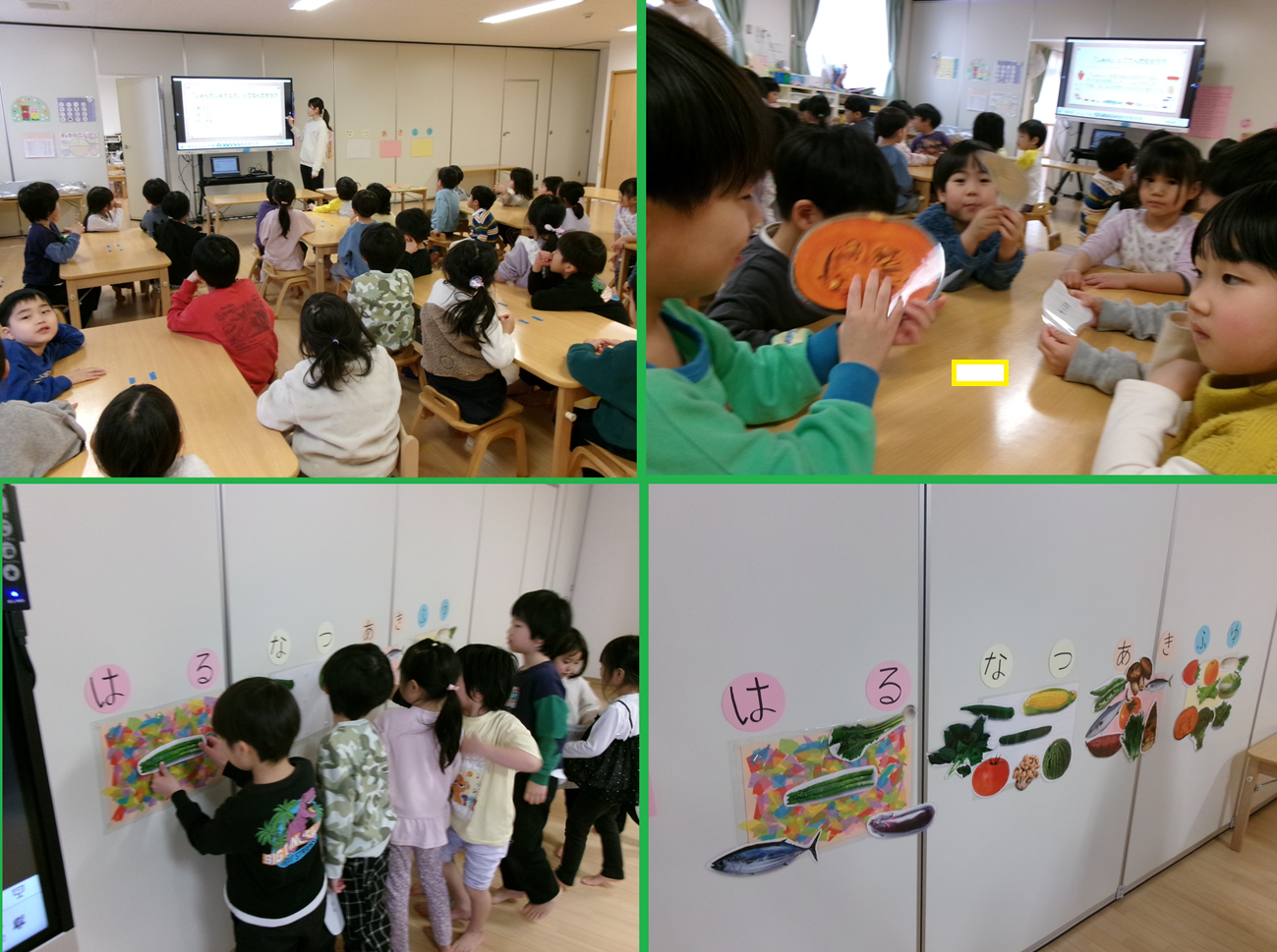 キッチンの先生から春夏秋冬によって美味しくなる食べ物のお話を聞きました。