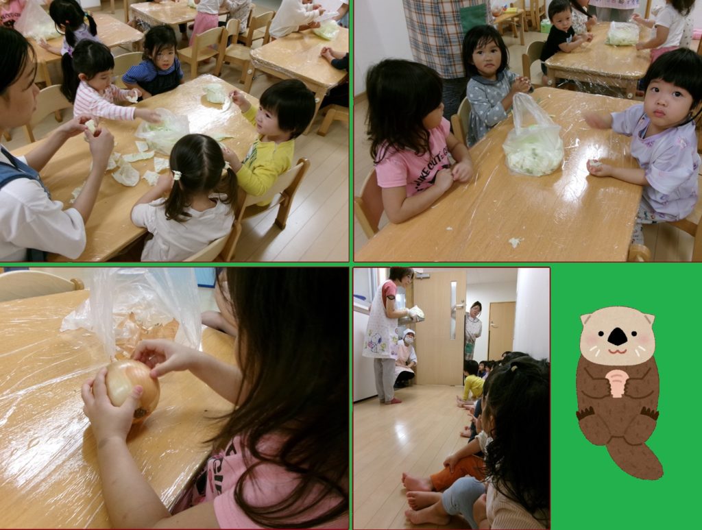 らっこ組(2歳児)が食育で野菜の皮むきをしました。
