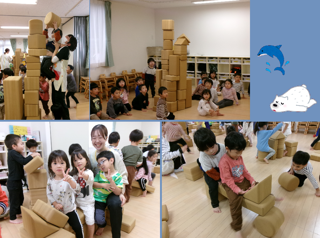 いるか組(3歳児)としろくま組(4歳児)は協力して大型積み木をどれくらい高く積み上げられるかなゲームをしていました。崩れてもめげずにお友達と協力しているいい場面が見れらました。