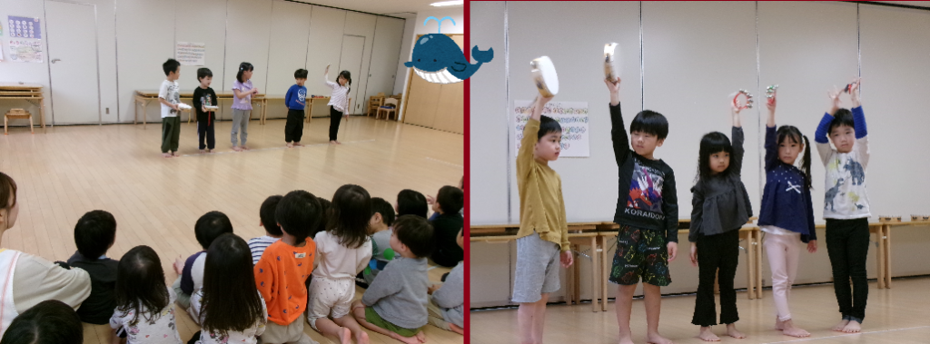 くじら組(5歳児)は子どもたち歌に合わせた楽器の鳴らし方、鳴らす箇所を話し合って発表!いるか組としろくま組のお友達がお客さんで来て「すごい~」「ありがとう~」と感謝の声にニッコリでした。