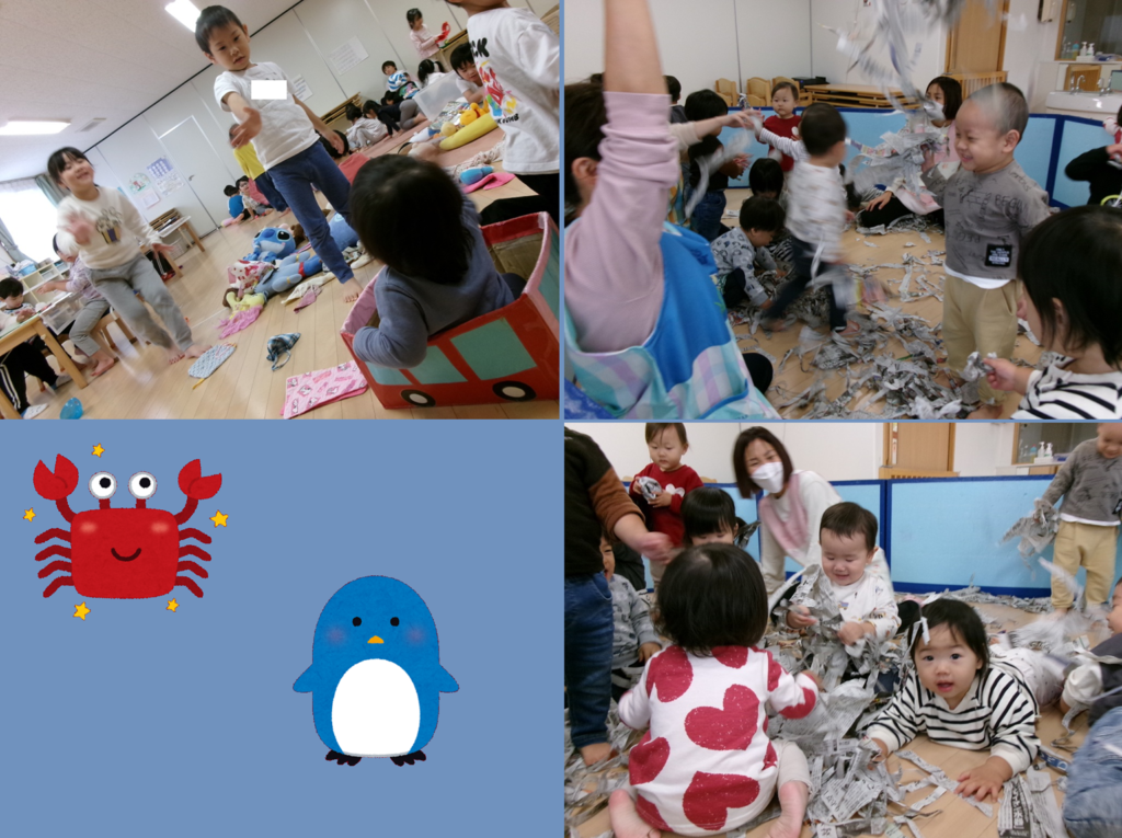 ぺんぎん組(1歳児)は新聞紙遊びに夢中♪