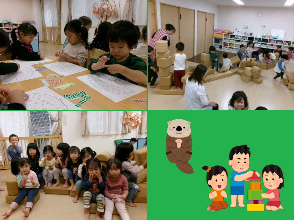 らっこ組(2歳児)はシール遊びと大型積み木を楽しんでいます。