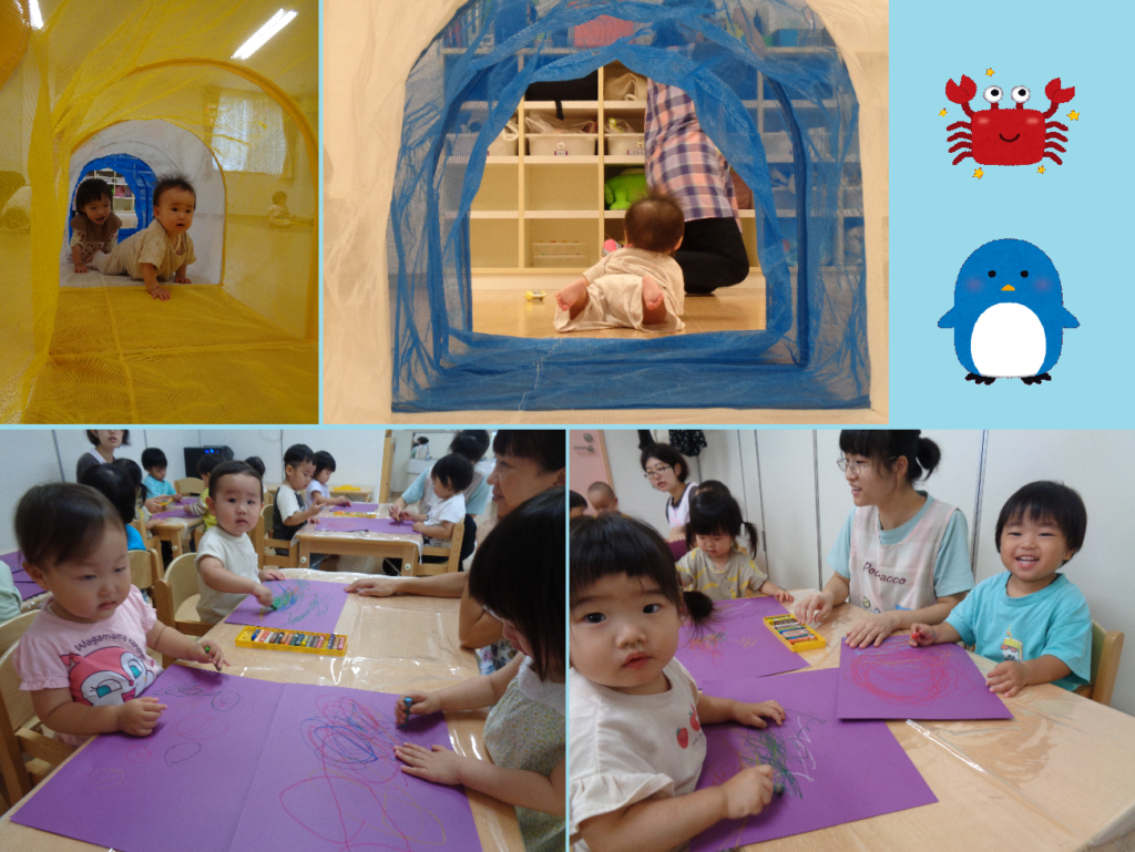 ぺんぎん組(1歳児)はみんなでお絵描き中…紫色の紙、秋、これは○○○○○になるのでしょうか!?