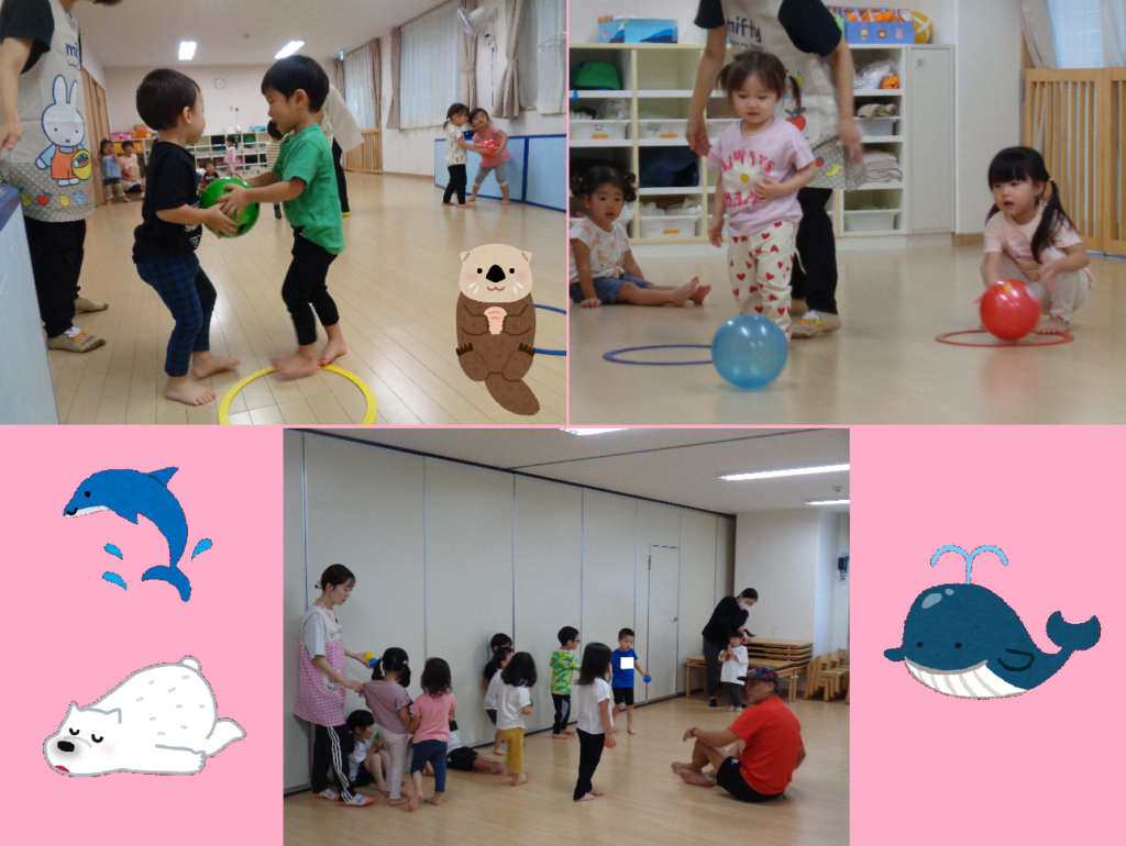 いるか組(3歳児)、しろくま組(4歳児)、くじら組(5歳児)は体操指導の日でした。運動会のダンス、パラバルーン、組体操を見てもらいました。