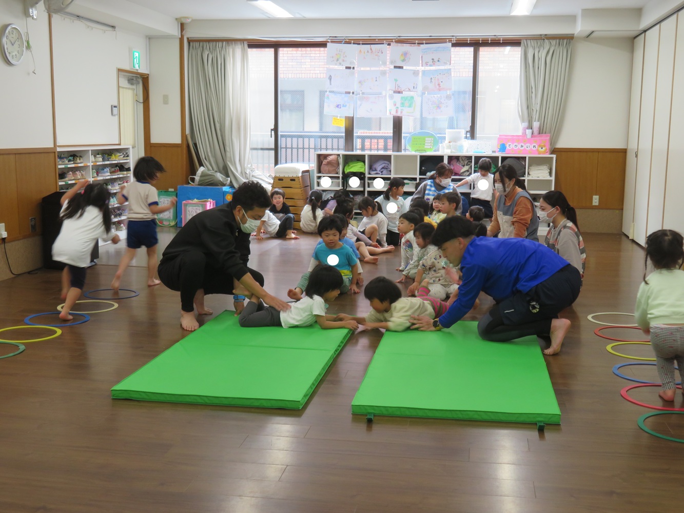 今日は、かぜ組の子ども達がはな組に交じり体操指導を体験しました。