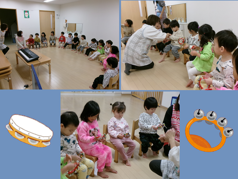 鈴とタンブリン、先生の鳴らし方を真似してシャンシャン♪