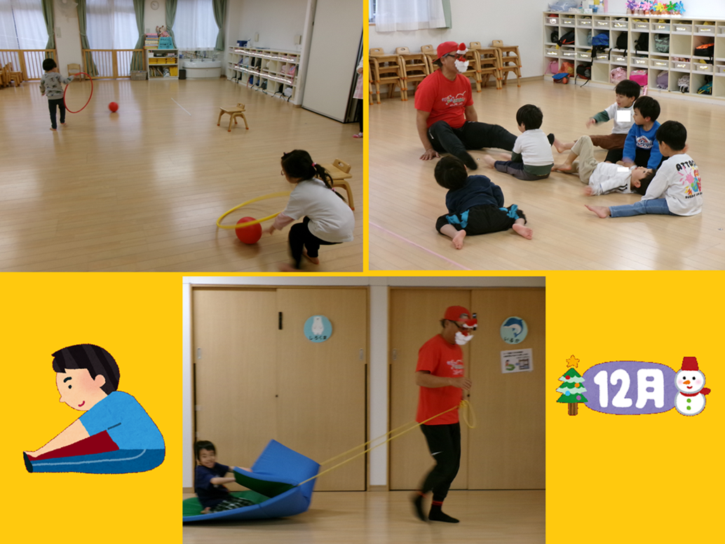 フラフープをソリ、ボールをプレゼントに見立ててプレゼント運びをして、クリスマスっぽい?運動を楽しみました。